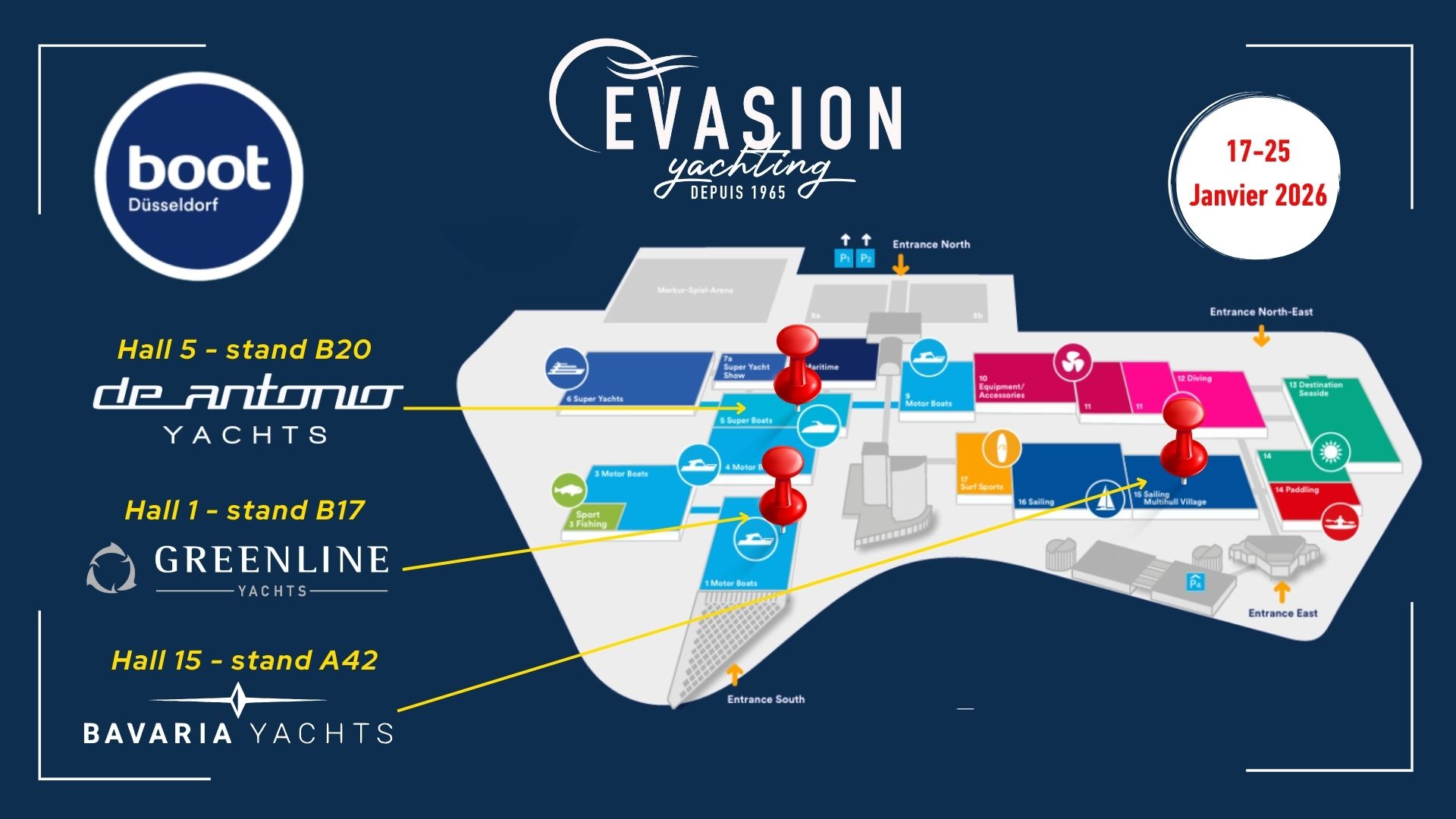 Du 17 au 25 janvier 2026, l’équipe d’Evasion Yachting sera présente au salon nautique de Düsseldorf sur les stands de nos trois marques : Bavaria Yachts, De Antonio Yachts et Greenline Yachts. Le Boot est un rendez-vous incontournable du nautisme européen pour préparer votre future saison de navigation. Rencontrez notre équipe dans un cadre unique. Que ce soit pour l’achat de votre premier bateau ou pour un changement d’unité, nous serons à votre disposition pour échanger sur votre projet.