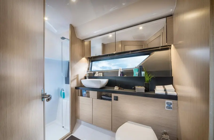 Le BAVARIA R40 dispose de deux cabines luxueuses, chacune avec un lit king-size, des finitions en bois élégantes et deux salles de bain privative équipées d’une douche séparée. La cabine du propriétaire à l’arrière offre également un sofa confortable, parfait pour se relaxer. La cabine des invités se distingue par sa flexibilité, avec un lit double qui peut se convertir en deux lits simples, selon vos besoins.
