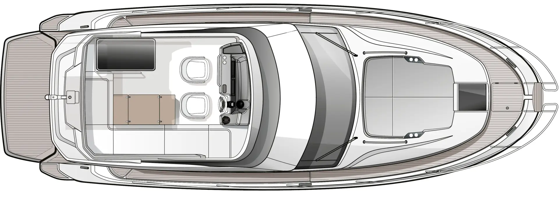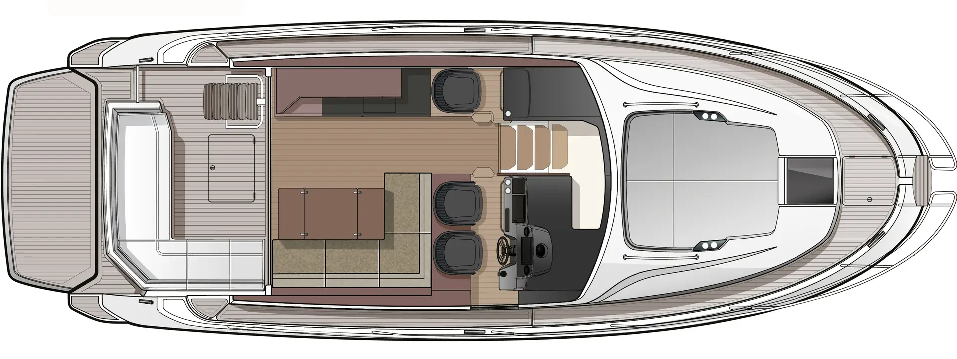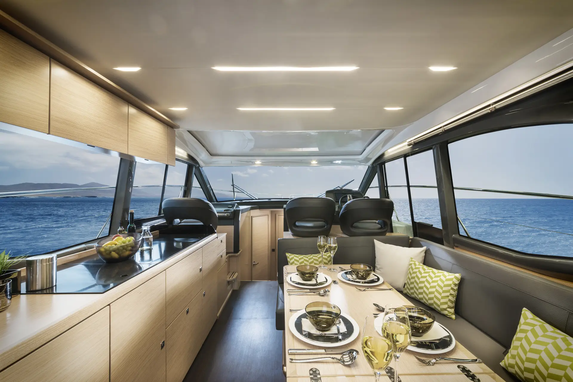 A l’intérieur, l’espace salon intègre parfaitement l’espace cuisine dans la longueur, créant ainsi une atmosphère conviviale. Les grandes baies vitrées laissent entrer une lumière abondante dans l’ensemble de l’espace de vie, accentuant la sensation d’espace et de bien-être. Les matériaux de haute qualité utilisés pour les boiseries, les tissus et les selleries ajoutent une touche de luxe et de confort sur ce bateau moteur de 12 mètres.