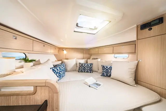 L’espace de vie est vraiment généreux à l’intérieur avec sa spacieuse cabine double à l’arrière et ses des lits de 2m de long et sa salle de bain fonctionnelle qui font du BAVARIA S29 un véritable bateau polyvalent pour les longs et courts séjour en mer. Une banquette pratique dans la cabine arrière la rend encore plus accueillante, belle et confortable. La table du salon peut facilement se transformer en couchage double, ou triple pour les enfants.