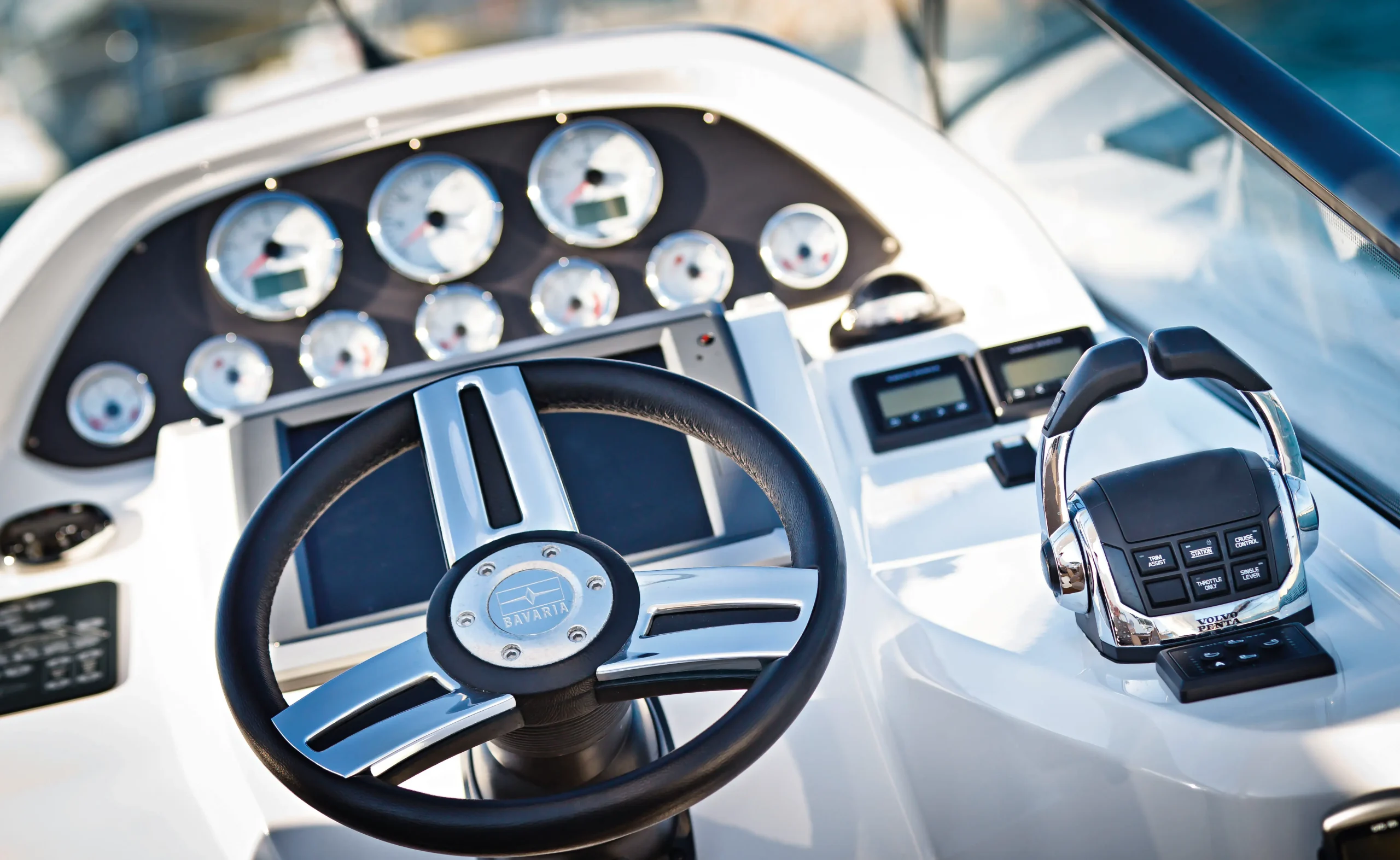 L’intérieur du BAVARIA S29, bien agencé, propose une cabine confortable avec un coin salon qui est vraiment facile à transformer en couchage. Le coin cuisine possède tout le nécessaire pour préparer un repas chaud avec des produits frais. Les nombreux hublots apportent de l’aération et une jolie lumière naturelle qui agrandit visuellement l’espace. Le poste de pilotage ergonomique, avec des instruments de navigation clairs, permet une conduite aisée et sécurisée, que ce soit pour des sorties côtières ou des aventures plus lointaines. L’avantage que l’on remarque sur les Bavaria moteur est également le sentiment de sécurité, pour les enfants comme pour les adultes, dès la prise en main du balcon inox. Aucune crainte d’aller sur le pont avant, même s’il y a un peu de mouvement.