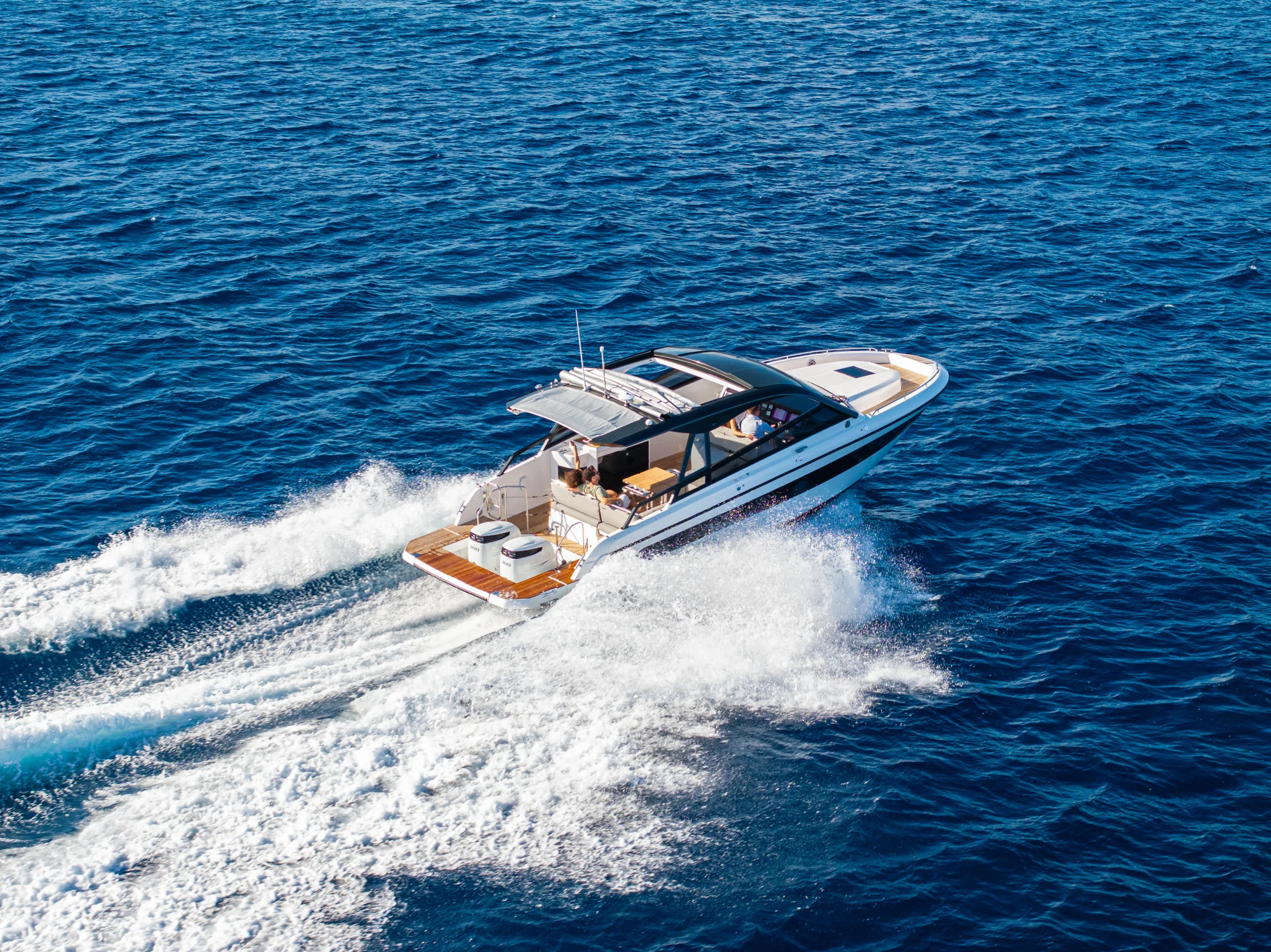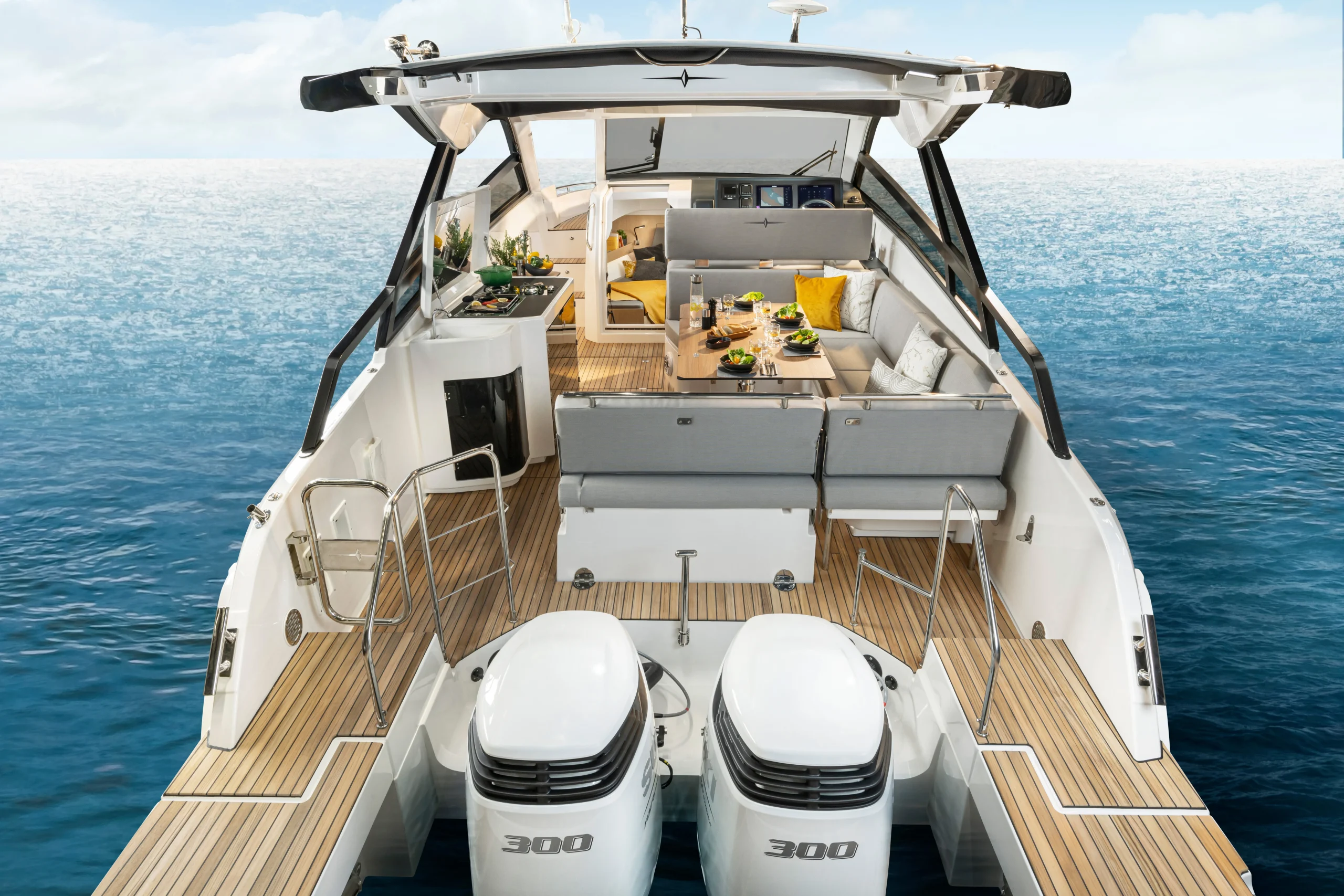 La version hardtop offre à la fois protection et luminosité à bord, tandis que le toit ouvrant souple située au-dessus du poste de barre permet à l’air de pénétrer dans le cockpit. La plateforme de bain abaissable hydrauliquement est disponible en option pour profiter de la baignade en toute sécurité et facilité la montée à bord.