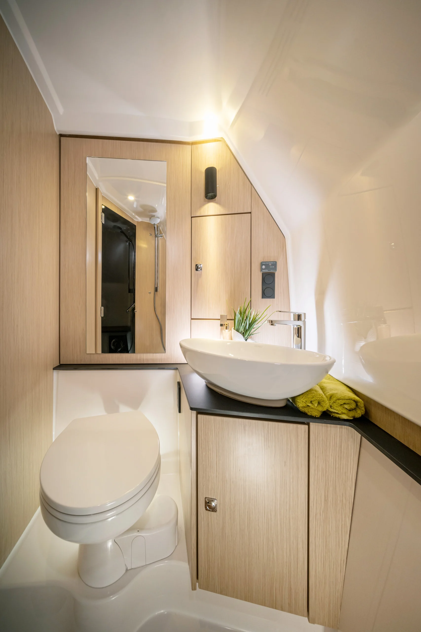 Le VIDA 33 surprend par son espace intérieur généreux sur un dayboat. Le salon se transforme en couchette confortable pour passer 1 nuit ou 2 au mouillage. La salle de bain est assez spacieuse pour un bateau de moins de 10 mètres de coque.
