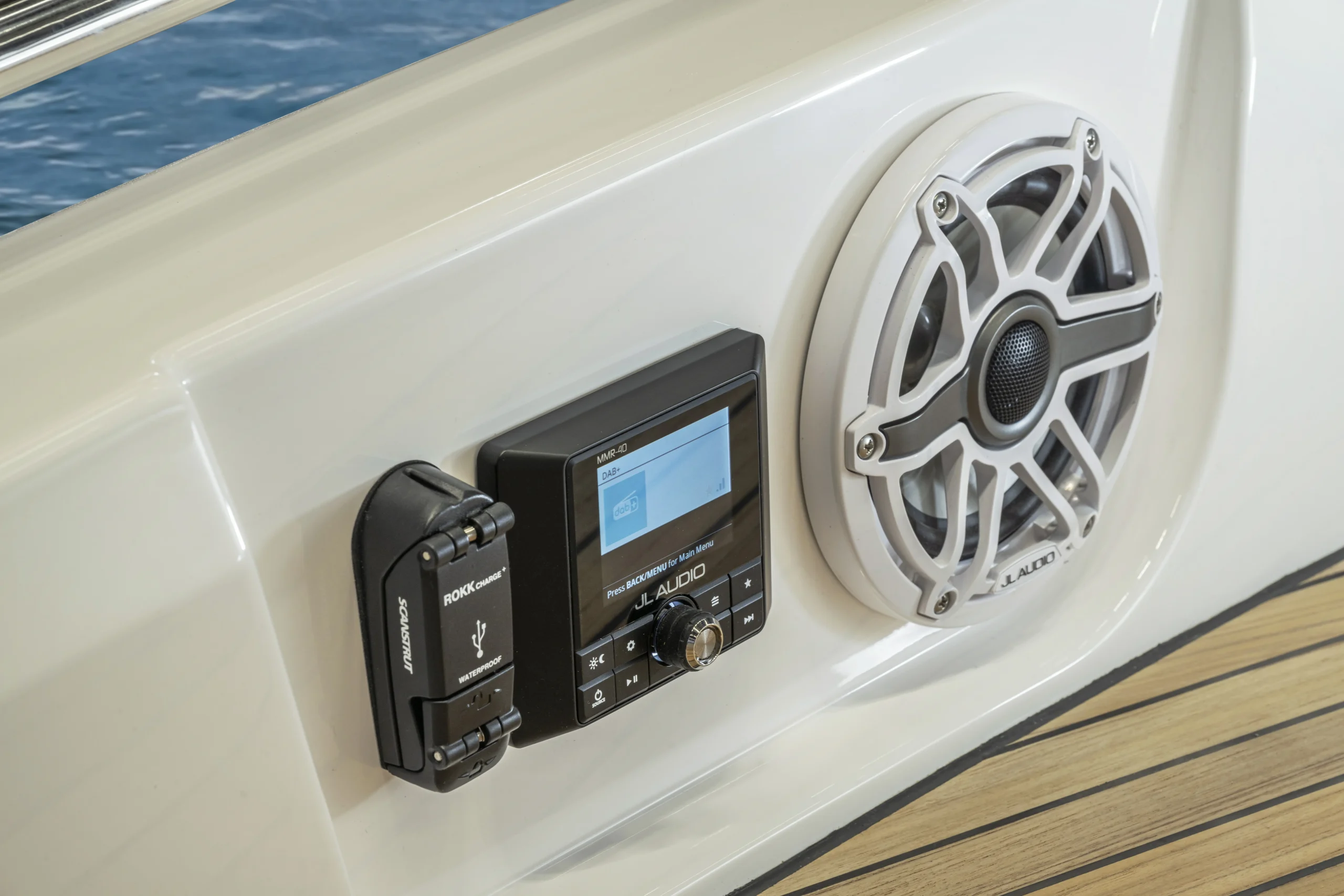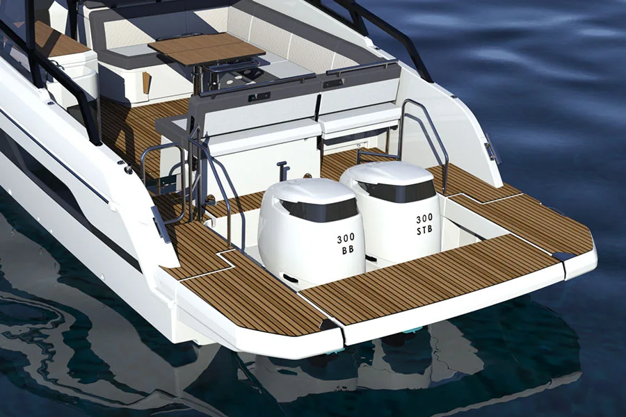 La plateforme hydraulique du VIDA 33 est un atout majeur. Située à l’arrière, elle permet un accès sécurisé et une montée à bord confortable, sans être gêné par les moteurs hors-bord. Cette fonctionnalité assure une sécurité accrue et tranquillise vos baignades autour du bateau.