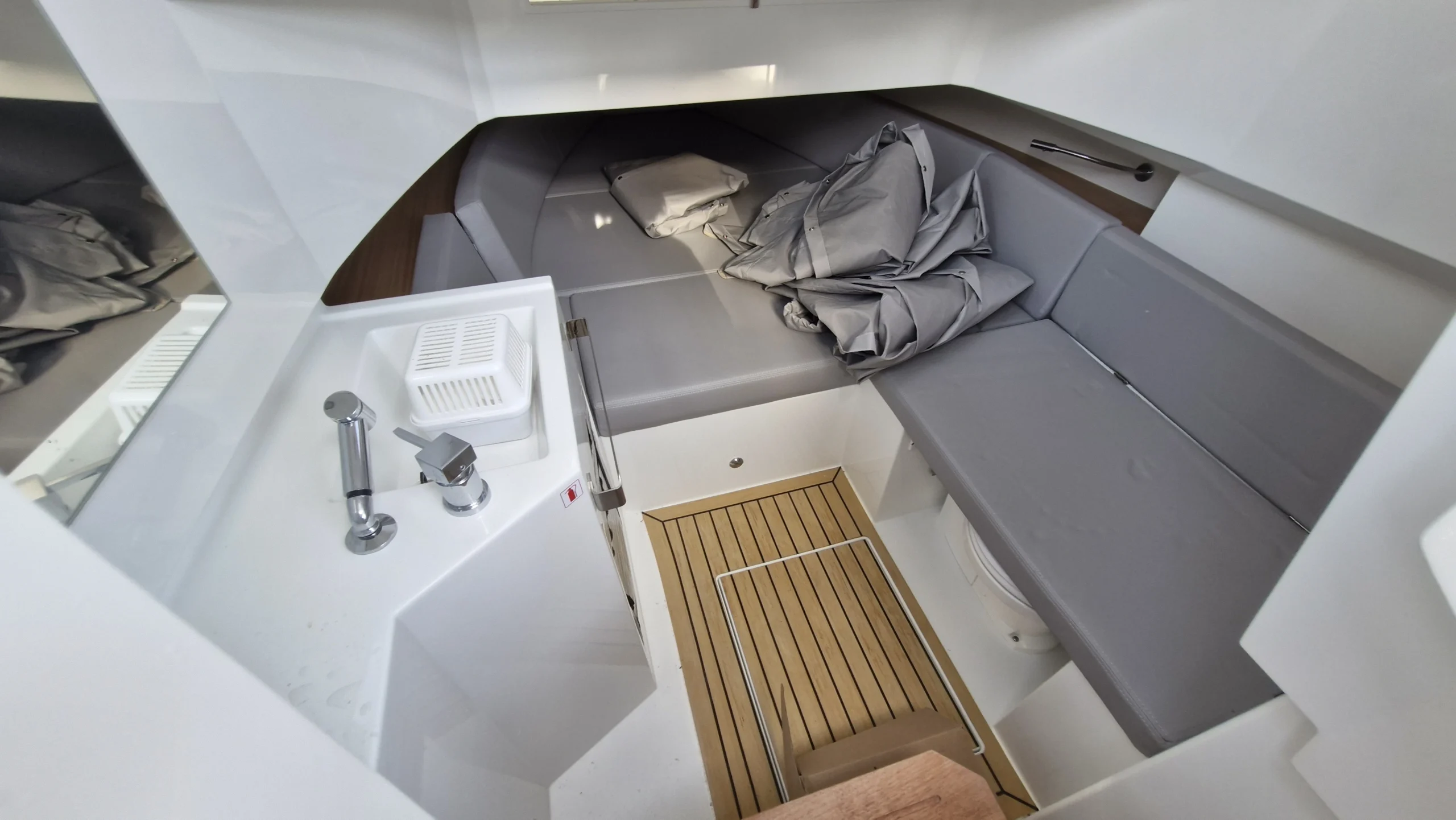 Sous la console, une cabine astucieuse accueille un couchage double, un lavabo et des WC, garantissant un confort appréciable pour prolonger le plaisir en mer.