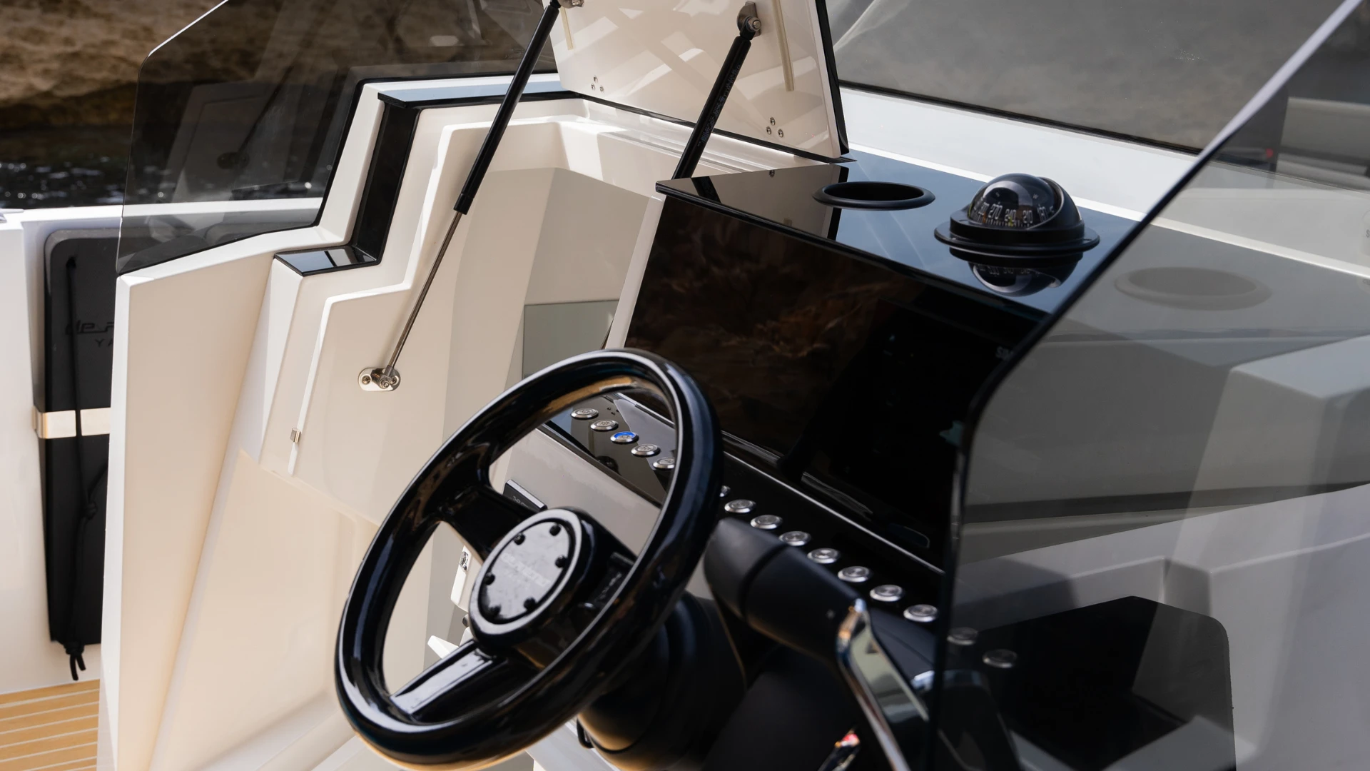 Avec une longueur de 7,99 mètres et une largeur de 2,99 mètres, le D29 présente un design raffiné et dynamique. Sa console noire confère une allure sportive à la timonerie, renforçant l’élégance de ce modèle. La plateforme arrière de 0,5 mètre supplémentaire ajoute un espace parfait pour un accès pratique et sécurisé à l’eau.