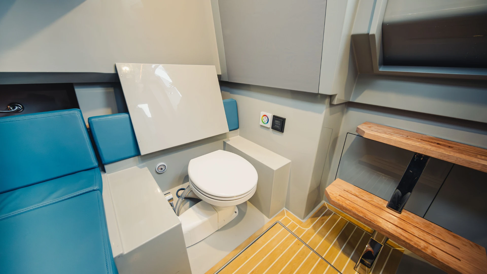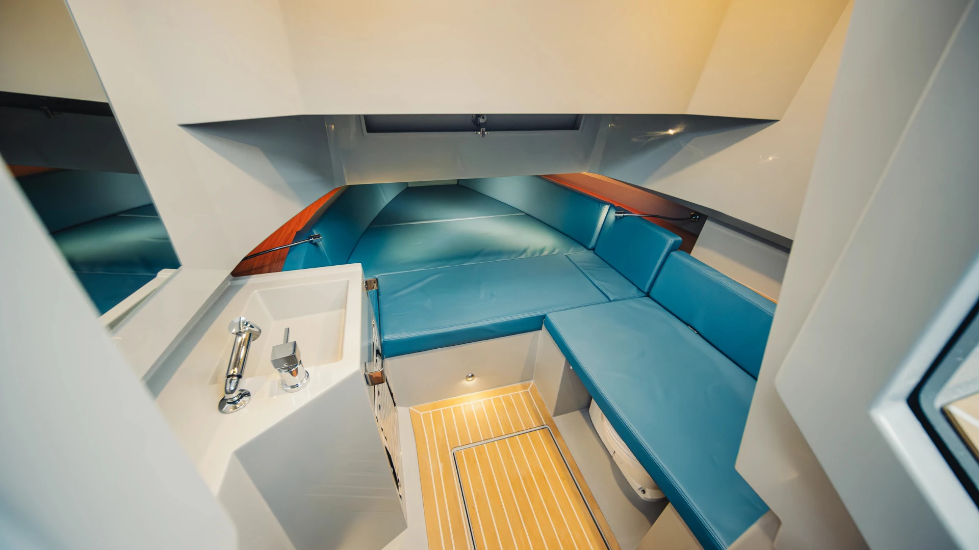 Sous la console, vous trouverez une cabine aménagée avec un couchage double, lavabo et WC, offrant un confort idéal pour une navigation prolongée. Son intérieur spacieux assure une hauteur agréable pour une expérience sans compromis.