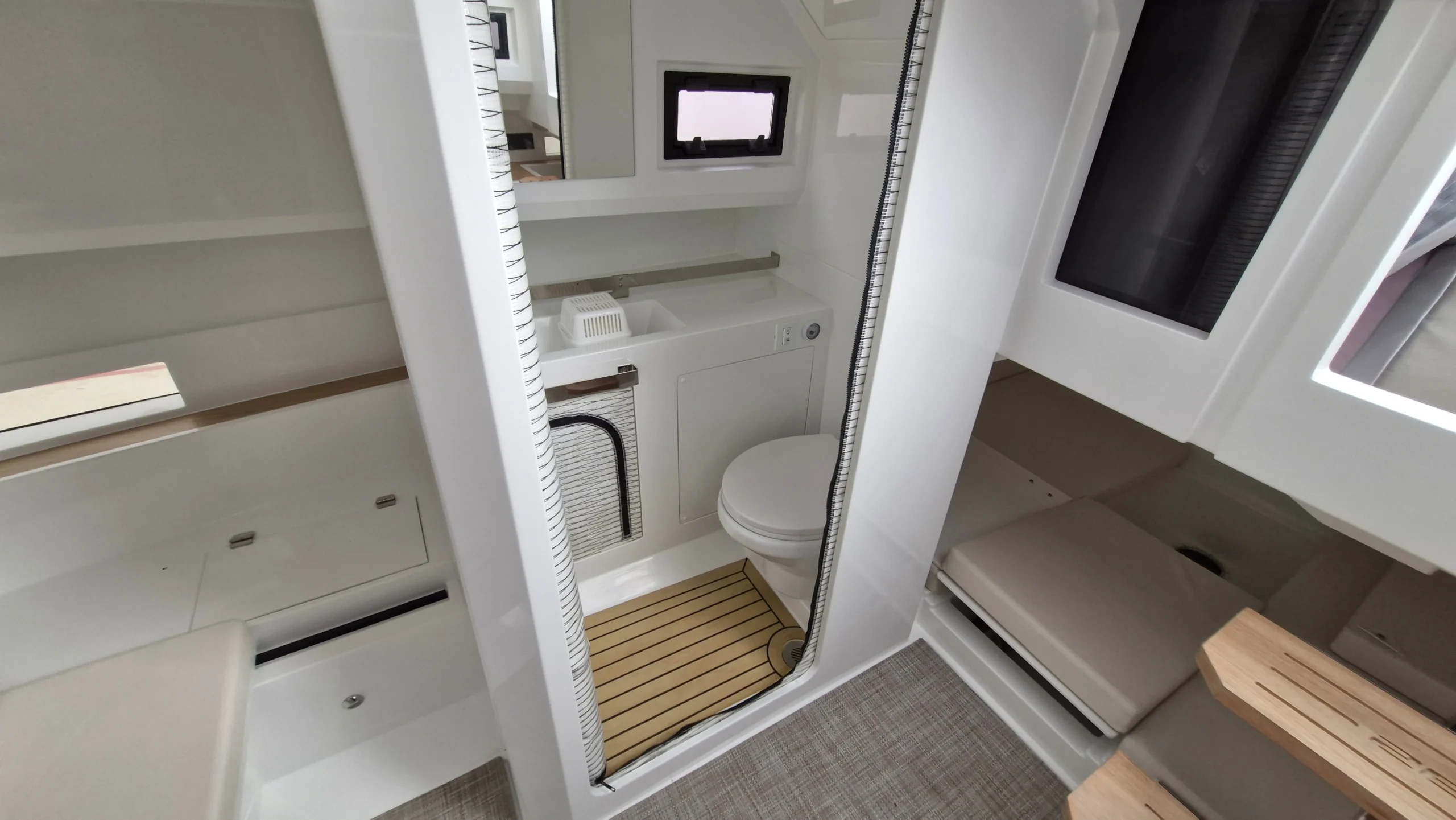 Tous les espace de ce Day boat D32 sont optimisés pour offrir un confort exceptionnel. La cabine avant est spacieuse et lumineuse, tandis que le salon ou cabine arrière invitent à la détente après une journée de navigation. L’aménagement intérieur dispose d’une salle de bains séparée. Les matériaux de haute qualité et les finitions soignées créent une atmosphère raffinée et apaisante. Vous vous sentirez chez vous, même en pleine mer.