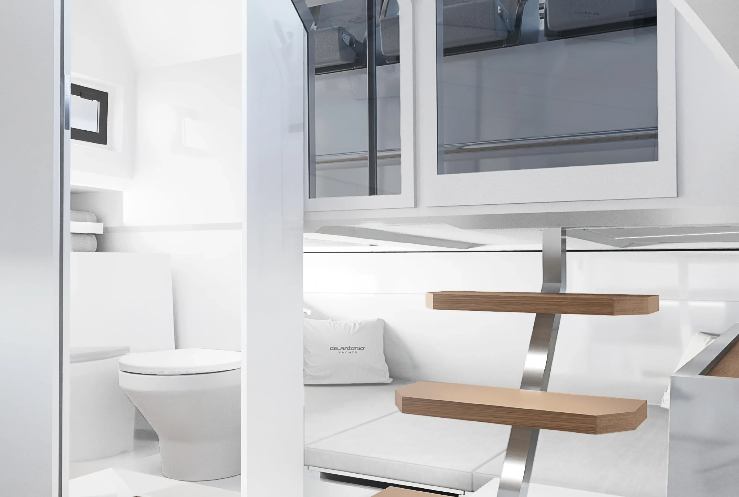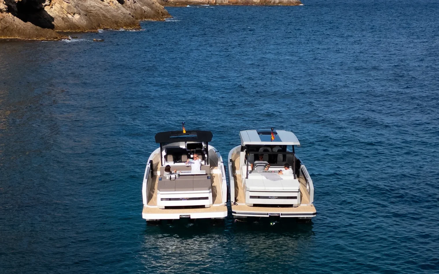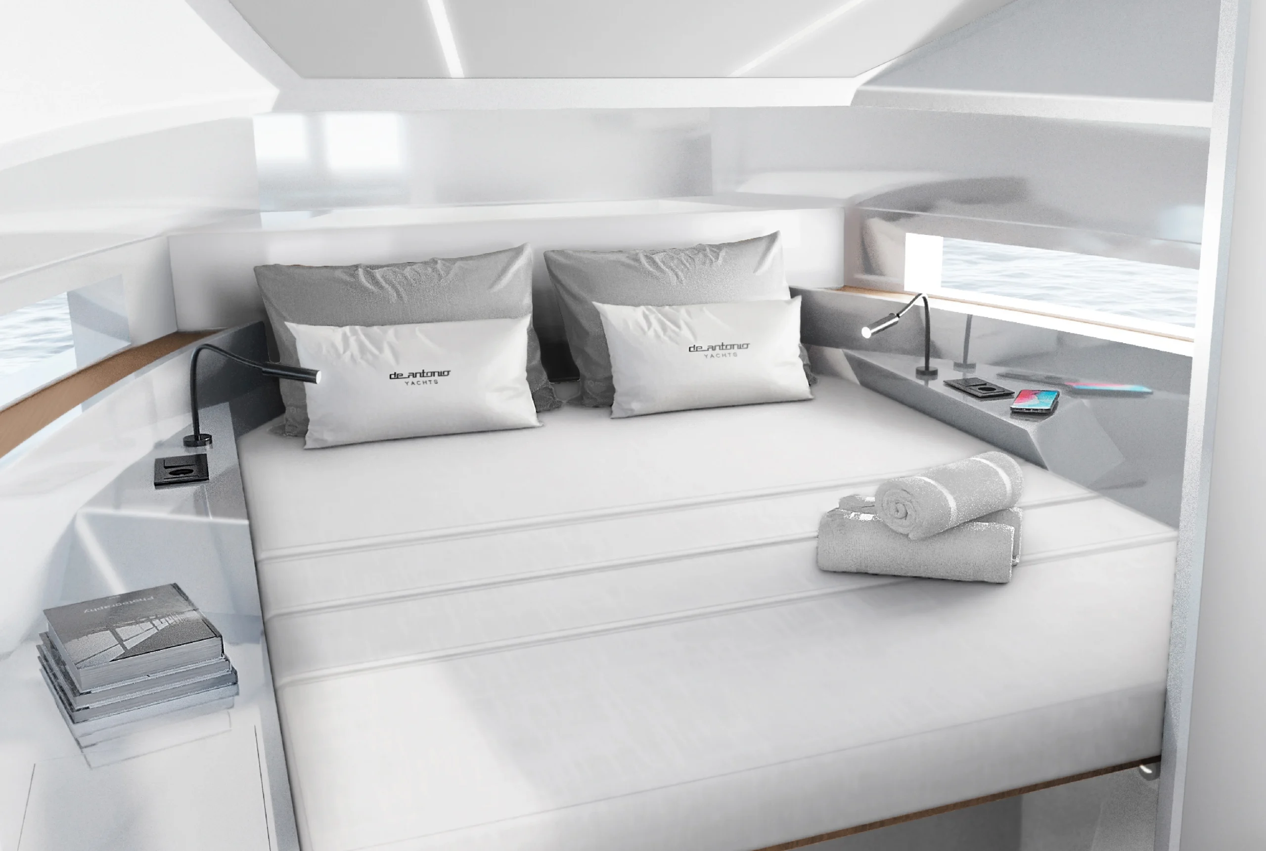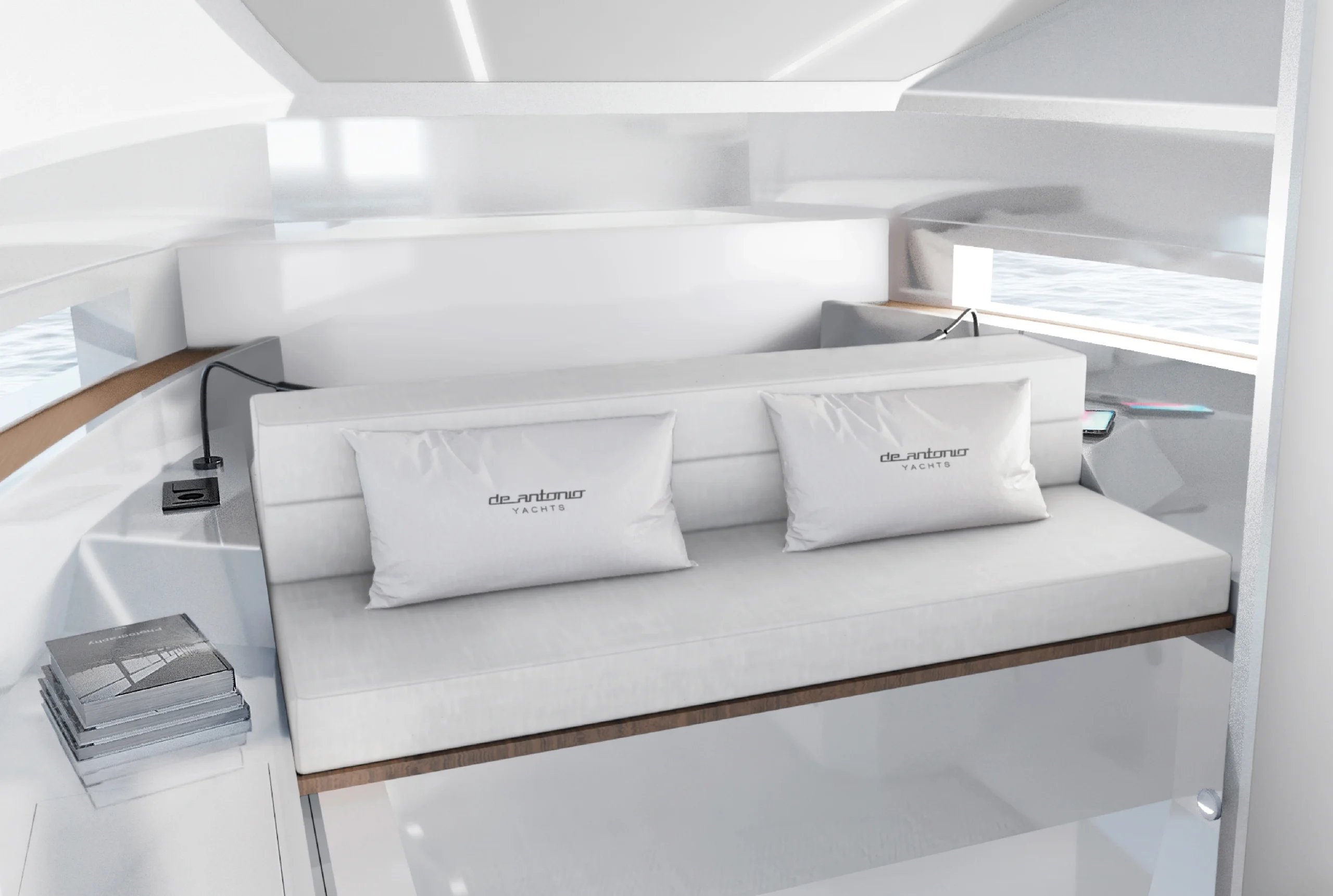 Le De Antonio D32 se distingue par une conception optimisée pour la convivialité et le confort. À bord, le pont walk-around crée un espace de circulation fluide, idéal pour les moments partagés avec amis et famille. Chez Evasion Yachting, on apprécie particulièrement cette disposition sécurisante, avec des hauts francs bords qui favorisent les échanges tout en sécurisant les déplacements à bord, même en navigation. Et, toujours les moteurs hors-bord cachés sous le bain de soleil, permettant ainsi d’avoir un bel espace de détente.