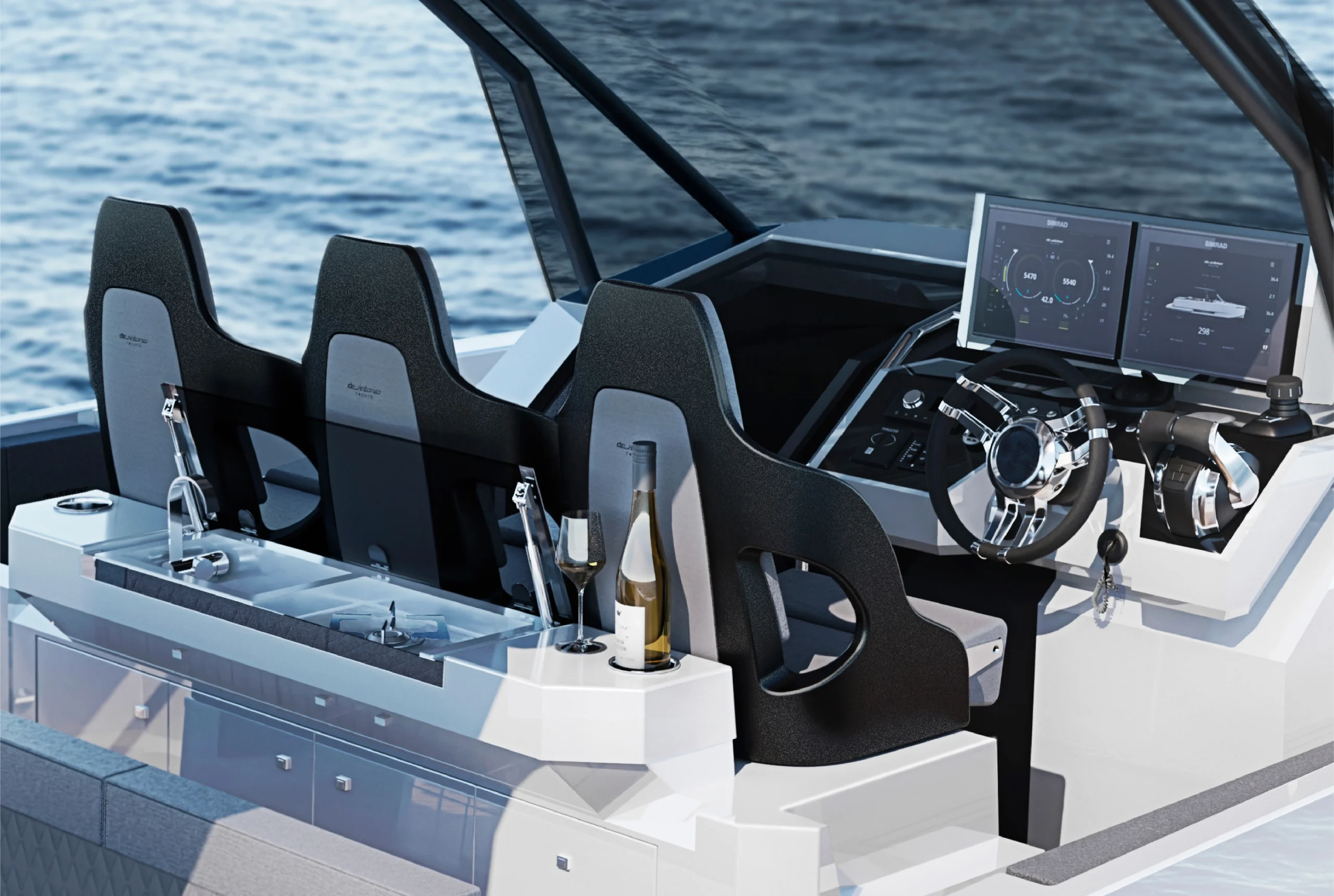 Naviguer à bord du Day cruiser D32 est une expérience qui allie la puissance à la facilité de manipulation. La coque haute performance vous offre une stabilité et une réactivité exceptionnelles, vous permettant de naviguer avec confiance, grâce au steps de la coque. Que vous cherchiez à repousser les limites ou à vous détendre lors d’une croisière tranquille, ce bateau répondra à toutes vos envies maritimes.