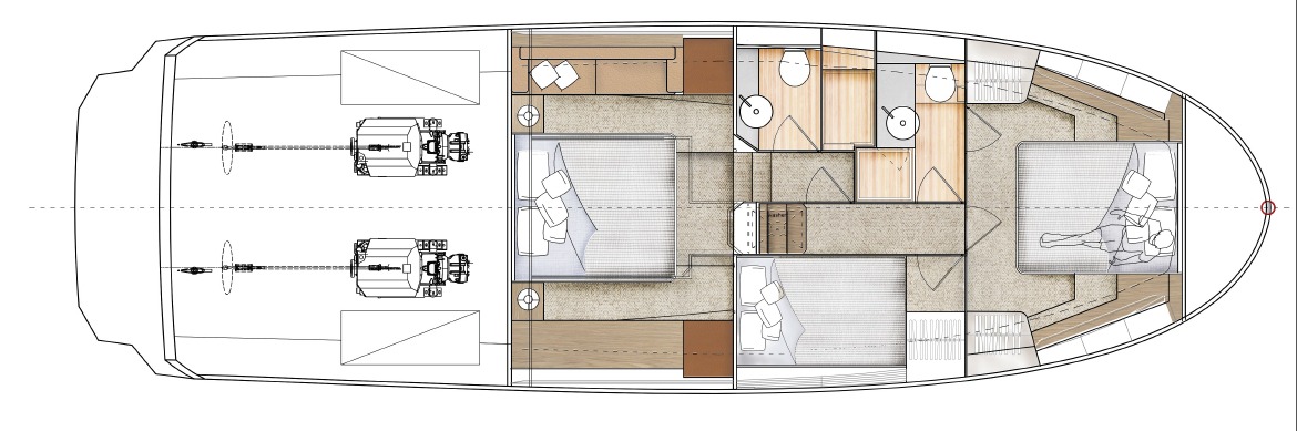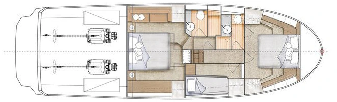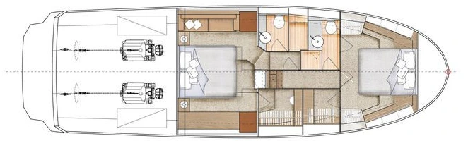 Le Greenline 45 se distingue par son aménagement personnalisable, avec le choix entre deux configurations de cabines : deux cabines avec dressings ou trois cabines pour accueillir jusqu’à six personnes, offrant ainsi flexibilité et confort pour des navigations en famille ou entre amis. Les propriétaires apprécieront les nombreux rangements pratiques et bien pensés, essentiels pour des séjours prolongés.