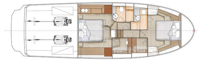 Le Greenline 45 est disponible en deux configurations : 2 cabines et 1 dressing en standard pour plus de rangements, ou 3 cabines pour accueillir jusqu’à 6 personnes. En version Fly, le vaste salon sur le flybridge offre un espace de vie supplémentaire, avec un poste de pilotage, un bain de soleil et un coin repas avec cuisine. La version Coupé, sans escalier pour le fly, maximise l’espace du cockpit pour recevoir en toute convivialité. De plus, le toit ouvrant du Coupé améliore la luminosité et la ventilation intérieure.