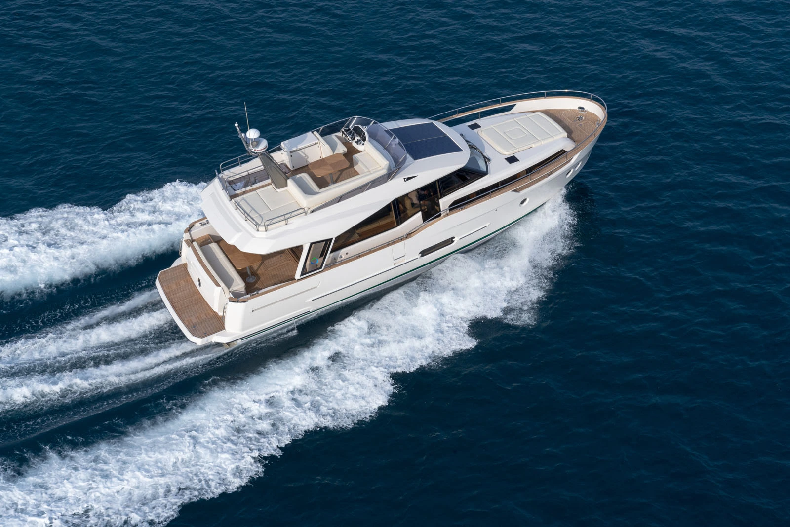En standard, la version Coupé est dotée de 8 panneaux solaires générant une impressionnante puissance de 2,64 kW, tandis que le modèle Fly propose des options pour augmenter l’autonomie avec des 2 panneaux solaires sur le toit du T-Top. Ces solutions rendent les Greenline 48 presque indépendants des ports pour l’alimentation en énergie, limitant la consommation de carburant et les nuisances sonores, une signature écologique de Greenline.