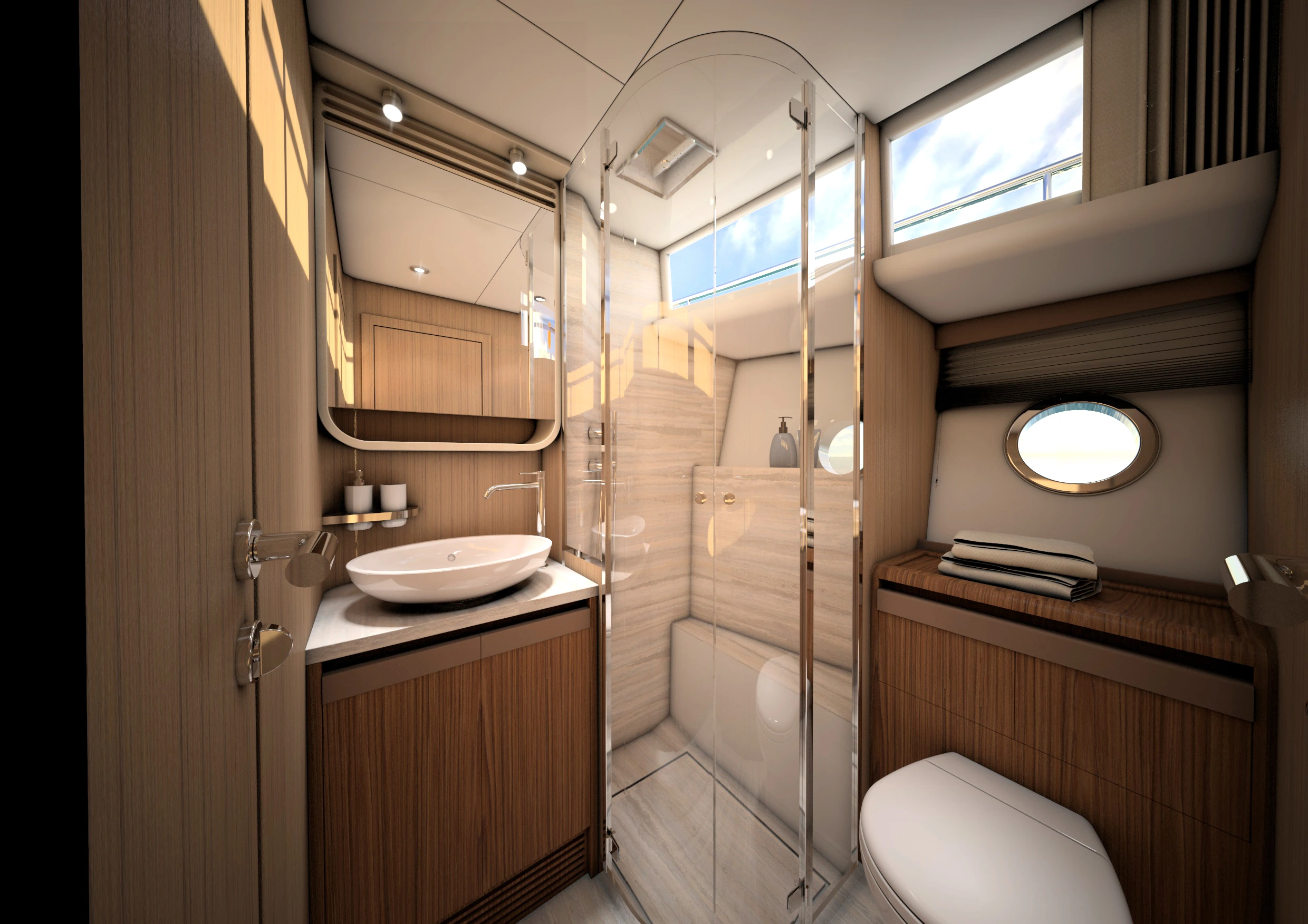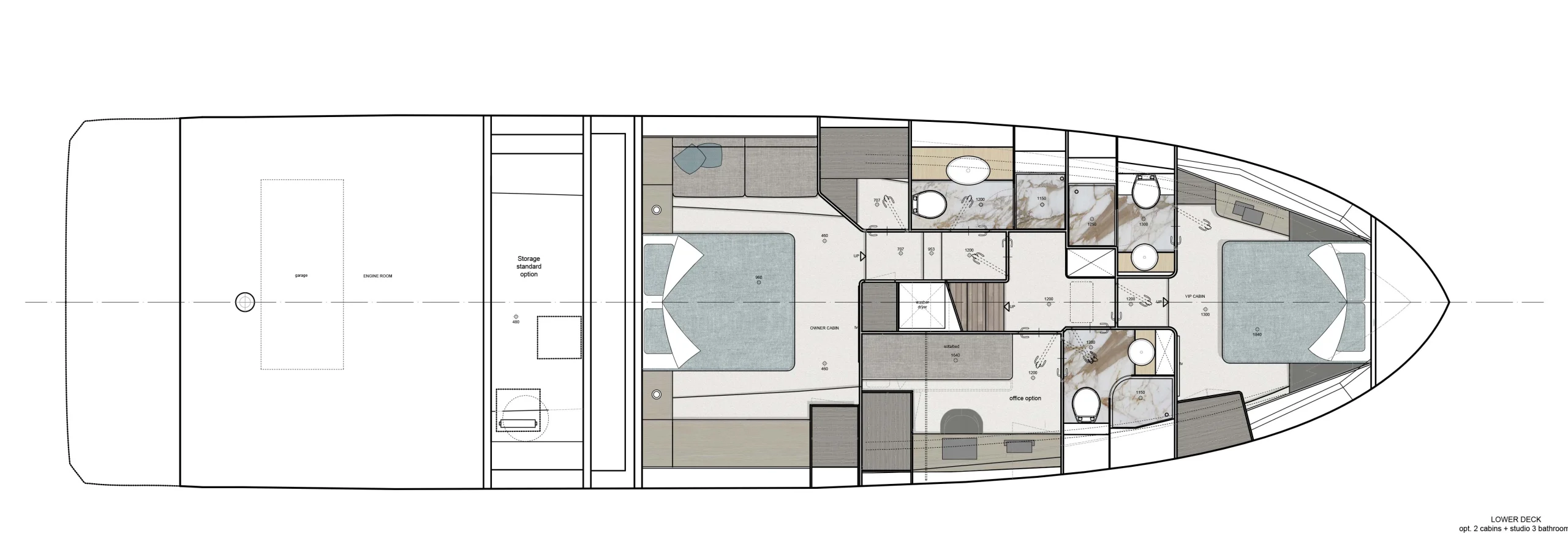Le Greenline 58 Fly est pensé pour offrir un confort et une flexibilité inégalés dans cette gamme de yachts. Les options d’aménagement intérieur permettent de personnaliser le yacht en fonction des besoins du propriétaire. En standard, le modèle dispose de trois cabines doubles. La cabine propriétaire s’étend sur toute la largeur du bateau avec une hauteur sous barrot de 1,96 m. La cabine VIP à l’avant et la troisième cabine peuvent être adaptées pour inclure une salle de bain supplémentaire ou un espace bureau. Ce dernier, avec des équipements modernes comme des écrans intégrés et des connexions HDMI et USB, est idéal pour les propriétaires qui souhaitent travailler à bord.