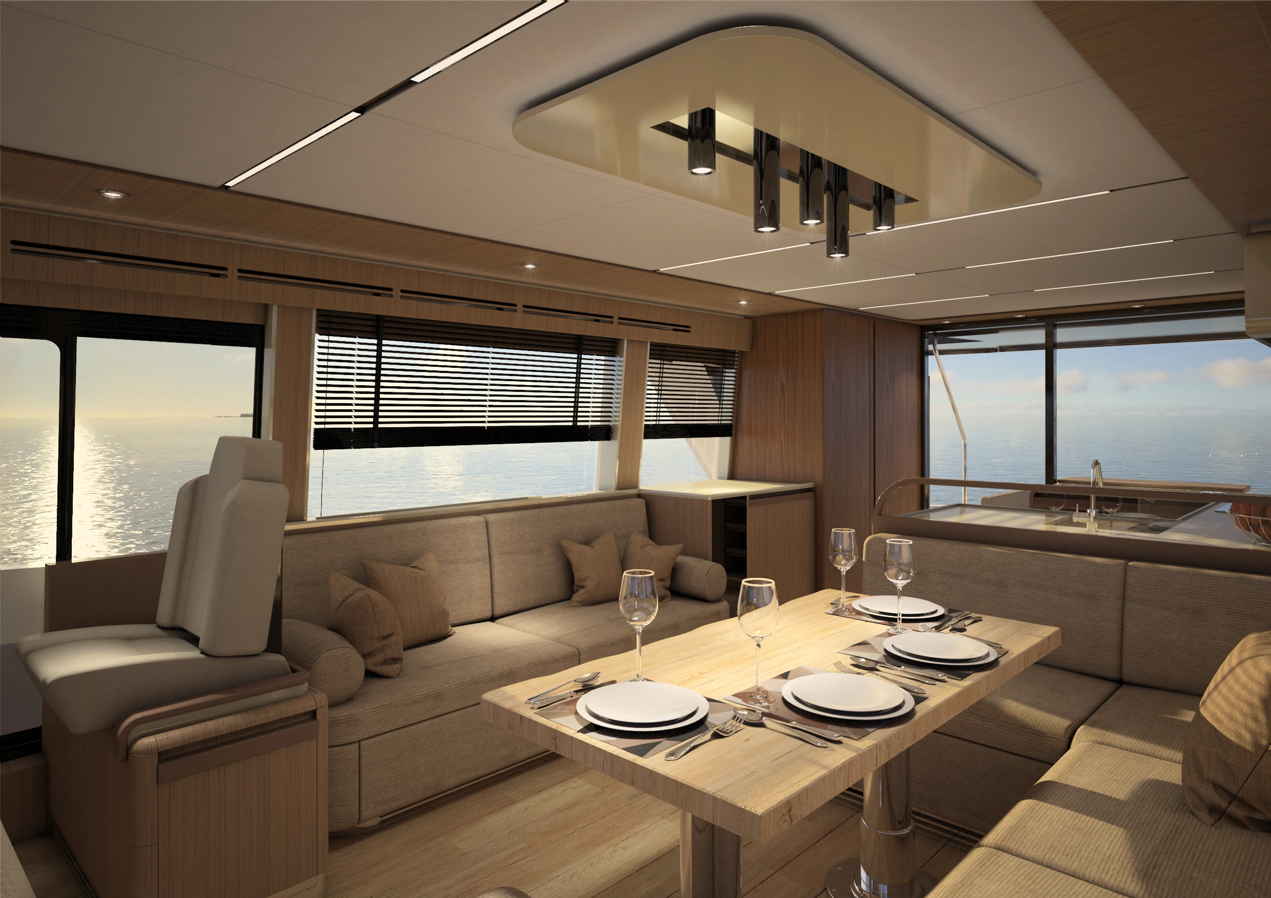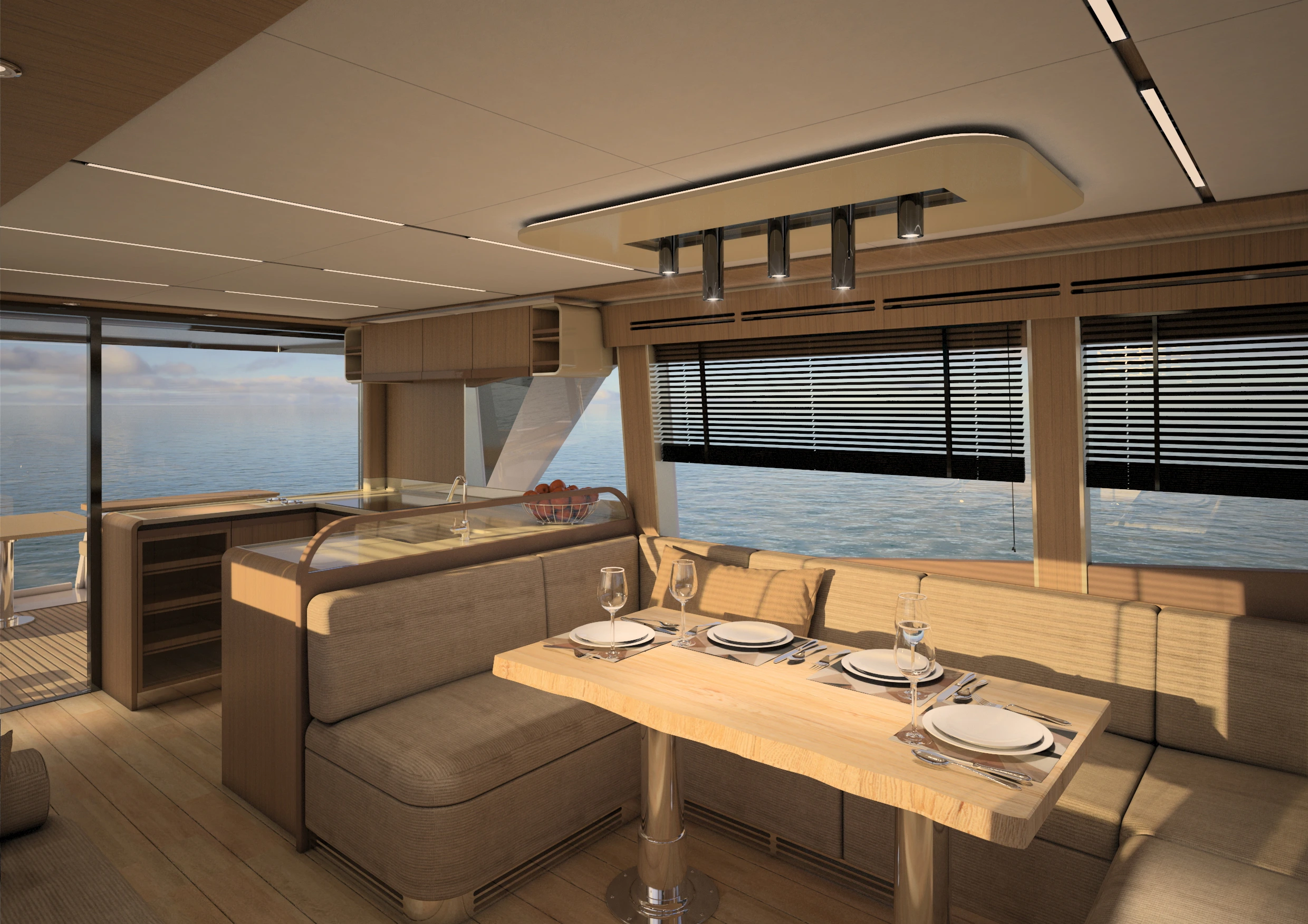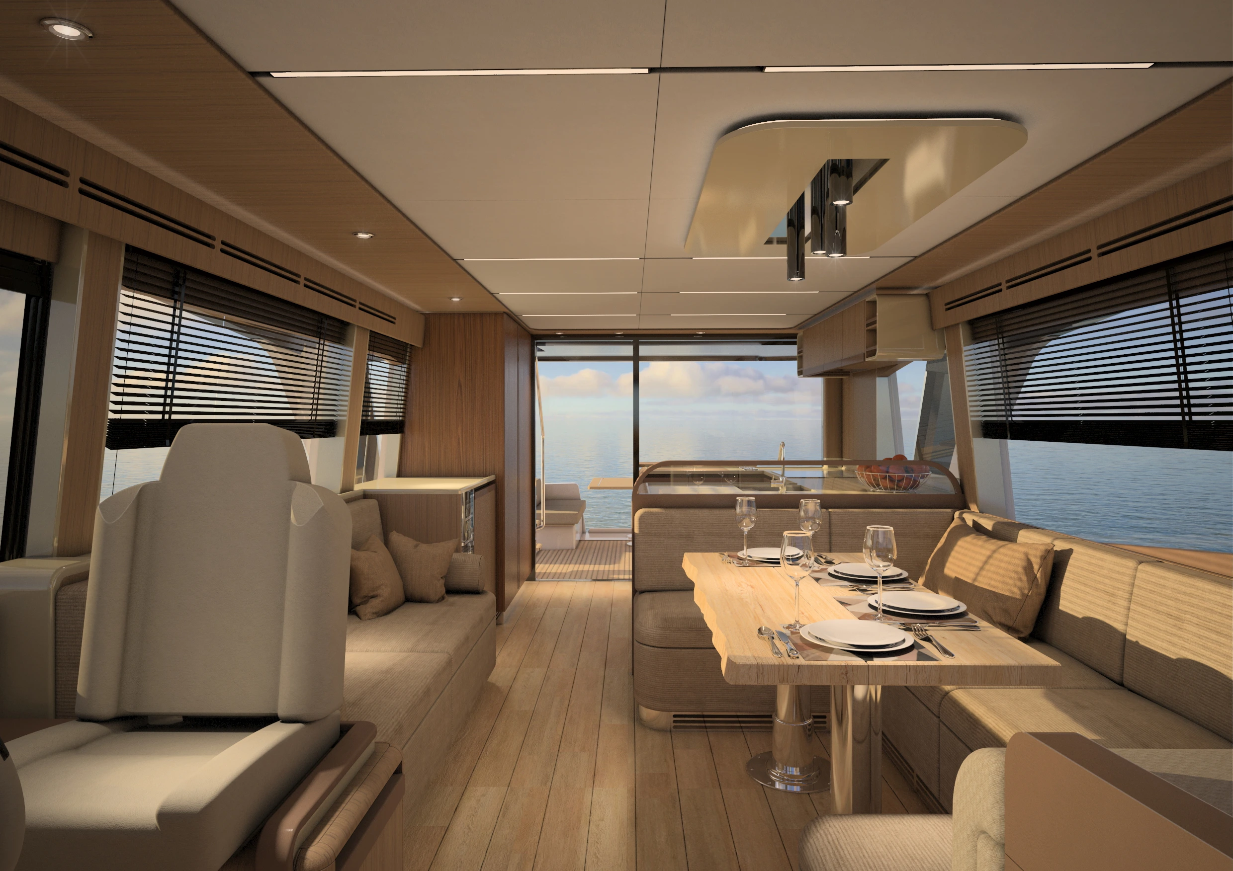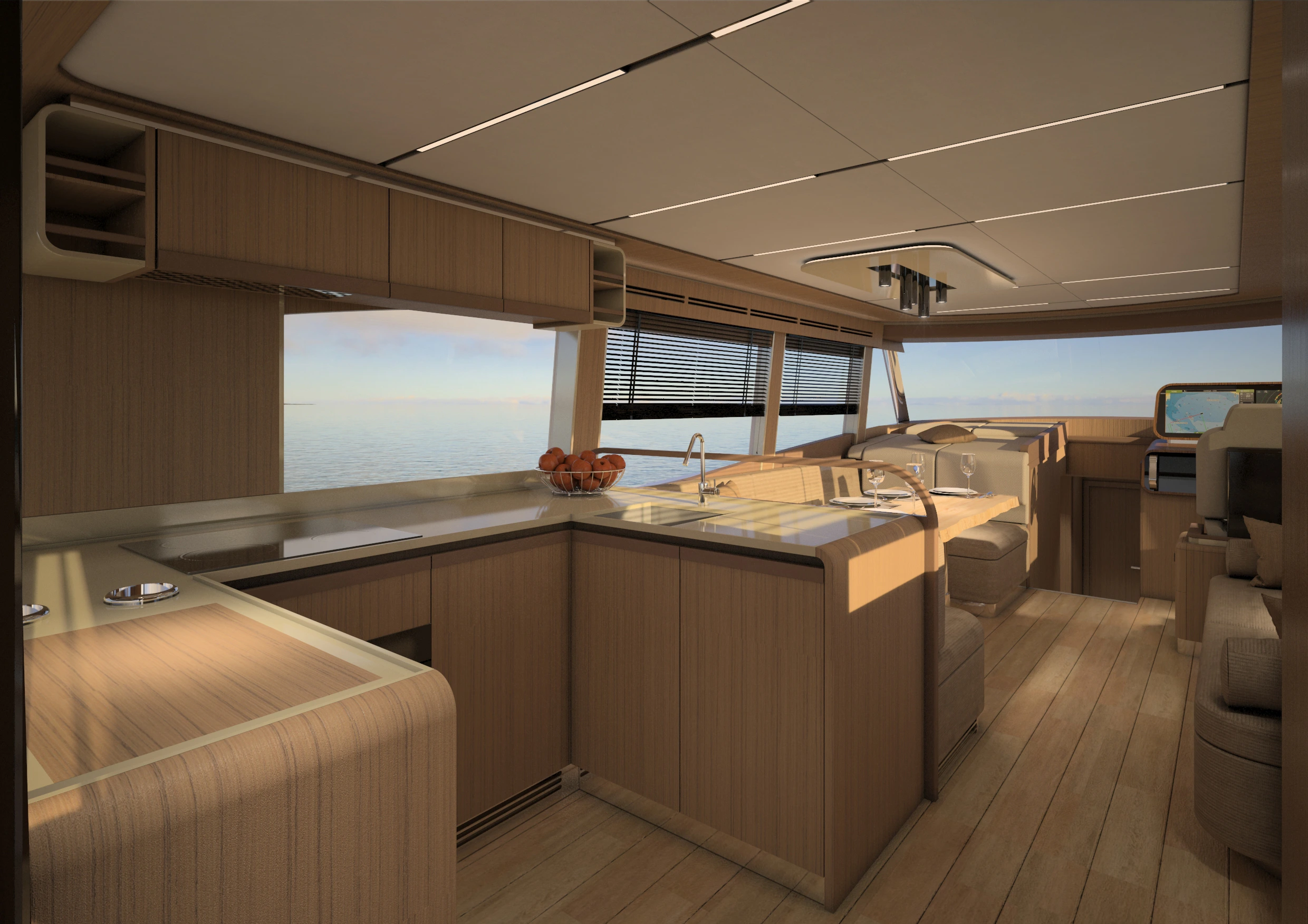 Avec le Greenline 58, Marco Casali, designer reconnu de Too Design, a su conjuguer esthétisme et praticité en créant des lignes modernes et marquées, sans compromettre les éléments phares de Greenline. Ce yacht offre un pont principal de plain-pied, avec une cuisine ouverte sur le cockpit, formant un espace de vie et de réception spacieux et lumineux. Le design inclut aussi des ouvertures dans les pavois à l’avant, permettant à la lumière de pénétrer et d’offrir une vue imprenable sur la mer depuis les cabines.