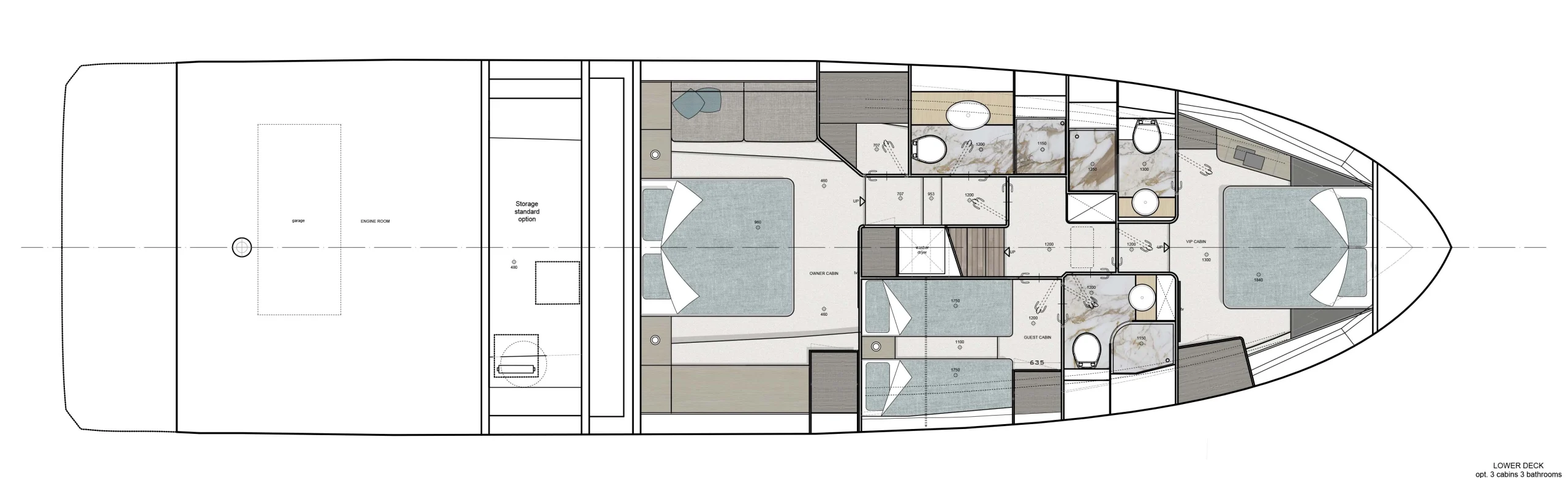 Le Greenline 58 est doté d’une motorisation performante, avec plusieurs options adaptées aux besoins de chaque propriétaire. Chacun pourra choisir la motorisation et la puissance souhaitée entre les moteur Man, Volvo ou Caterpillar de 2×730 à 1000CV. Pour ceux qui recherchent encore plus de puissance, la double motorisation Caterpillar de 1000 CV permet d’atteindre jusqu’à 30 nœuds.