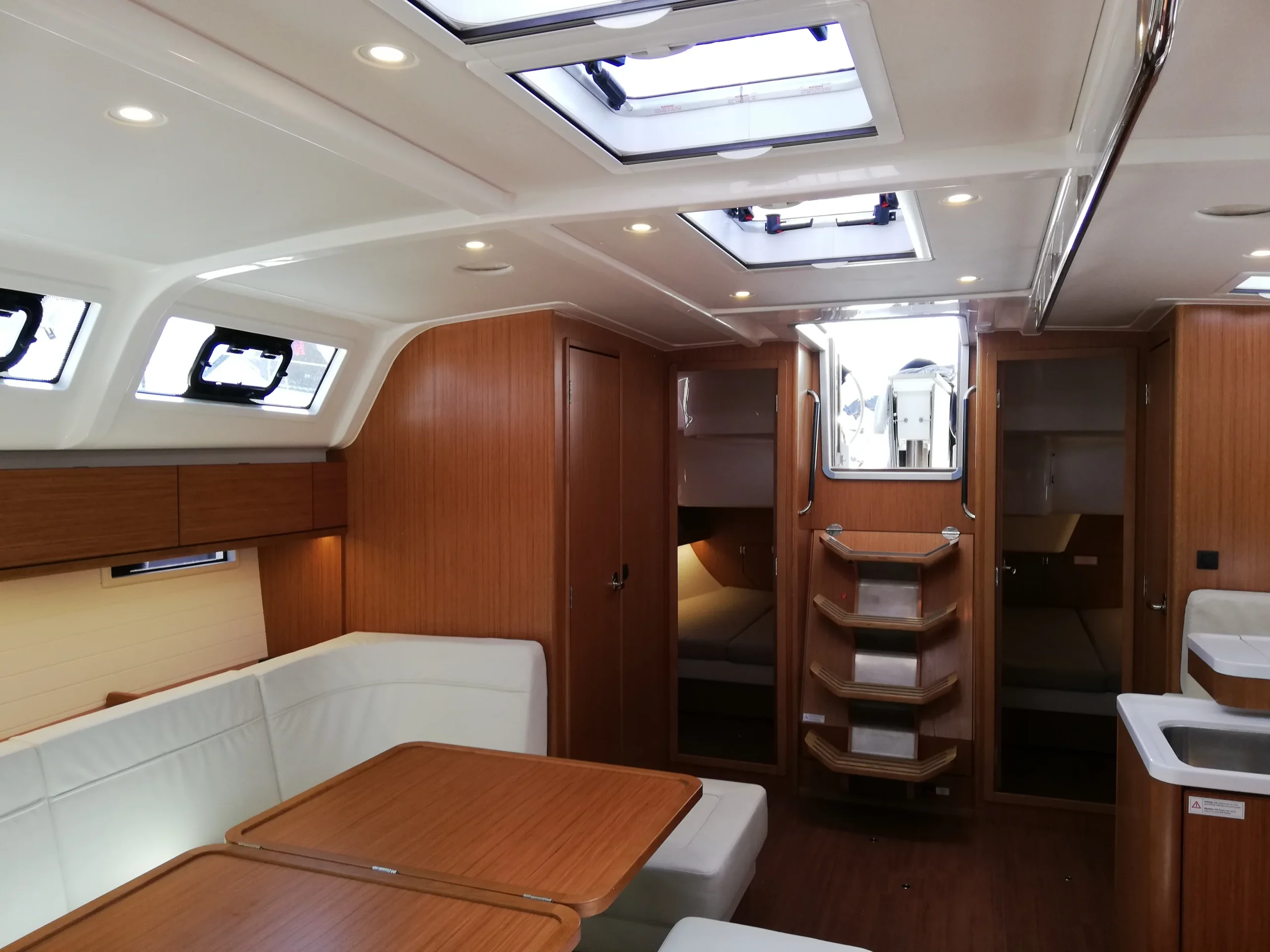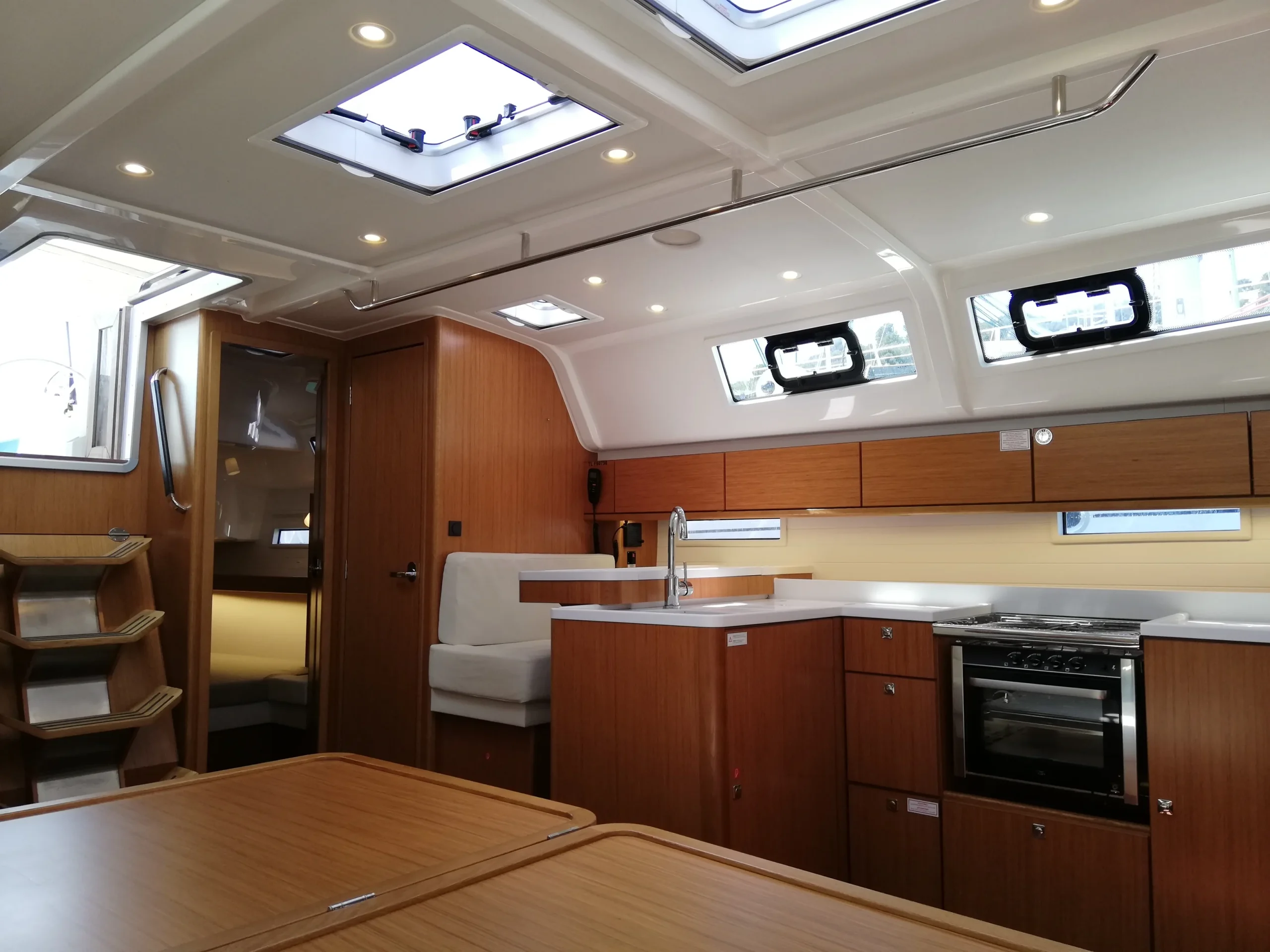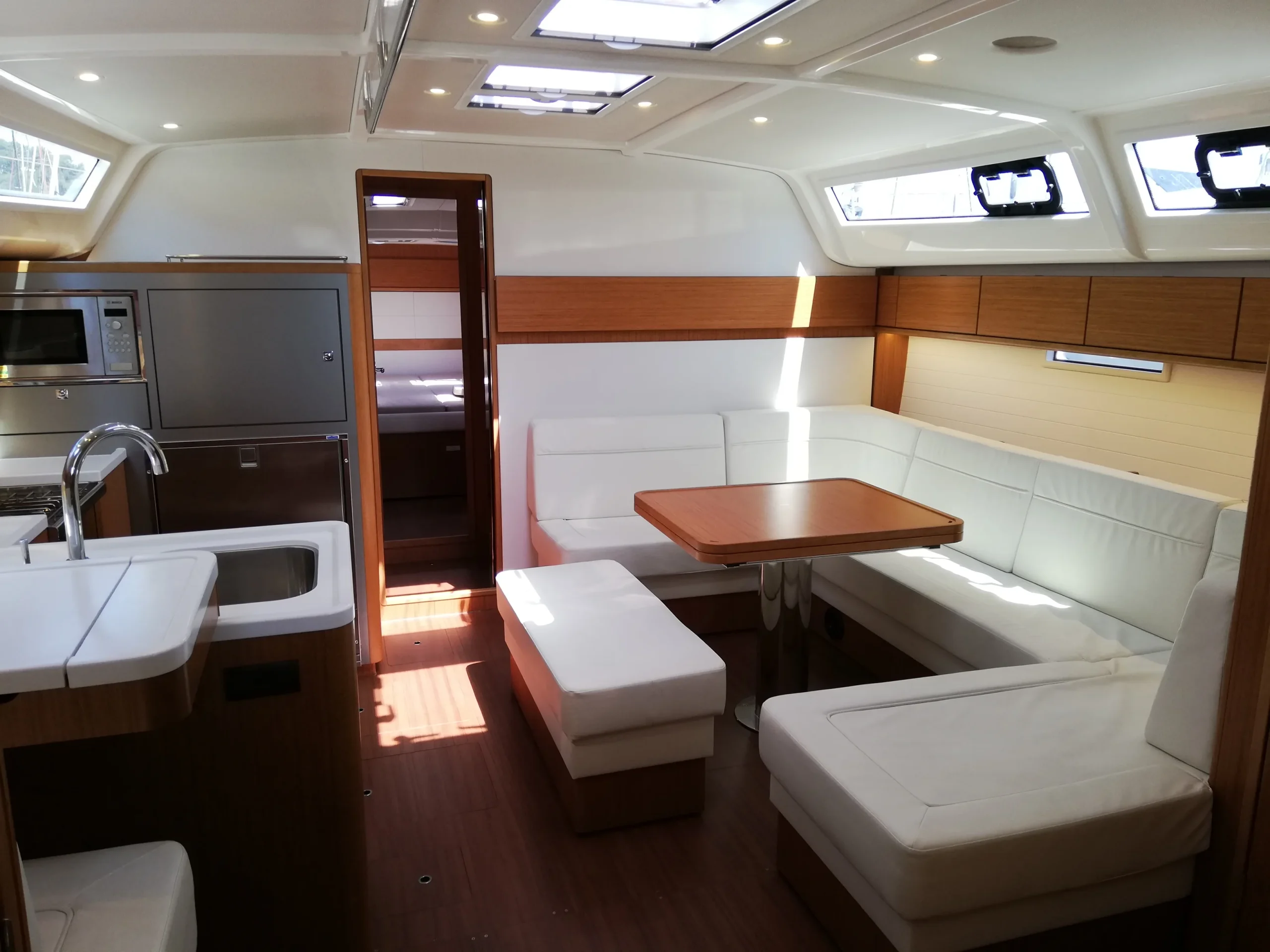 Chacun trouvera sa place grâce aux 3 cabines doubles, et la 4eme cabine avec lit superposés, idéale pour les enfants comme pour les grands. Les 3 salles d’eau sont un confort à bord lorsqu’on est nombreux. La grande cuisine équipée permet aux chefs de préparer de bons repas pour l’équipage, qui trouvera aisément sa place dans le carré.