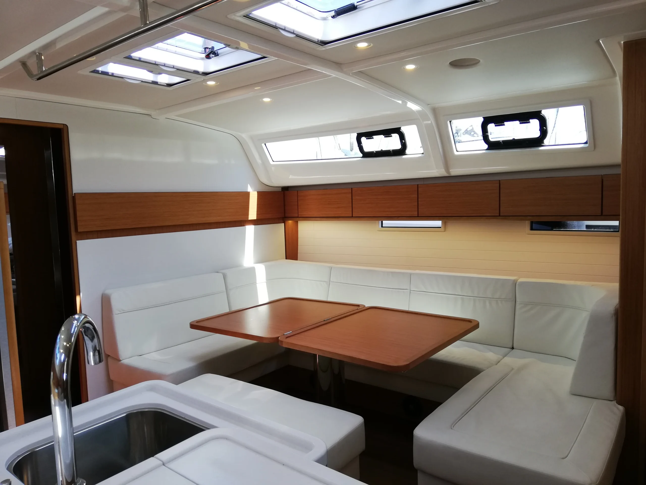 En entrant dans le salon du BAVARIA CRUISER 51, deux mots seulement vous viennent à l’esprit : « wow » et « gigantesque » ! C’est un espace impressionnant – impressionnant par sa taille, impressionnant par son ambiance. Il est doté, d’un éclairage indirect LED à variation et d’une abondante lumière naturelle.