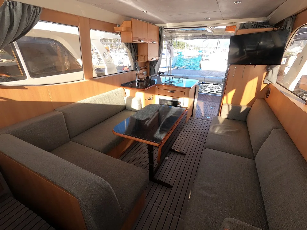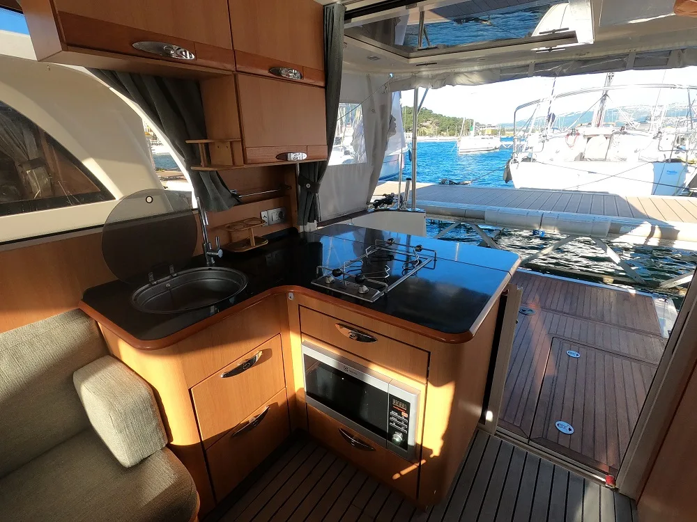 vous pourrez prendre un bain de soleil sur le pont avant, ou vous reposer à l’ombre de la casquette dans le cockpit arrière. Les passavants du Greenline 33 vous permettent de circuler autour du bateau en toute sécurité, même pour les enfants. Au niveau du cockpit à l’arrière, la grande plateforme de bain électrique permet d’agrandir l’espace de vie extérieur pour profiter d’un petit repas en famille ou se baigner tranquillement dans les plus beaux mouillages de la région de la Côte d’Azur. Le plus des Greenline, leur cuisine ouverte sur le cockpit qui permet de cuisiner face à la mer, tout en profitant de vos invités.