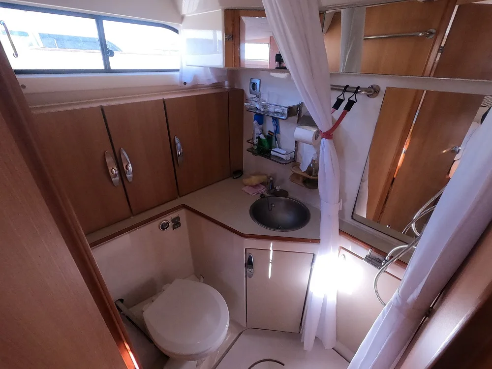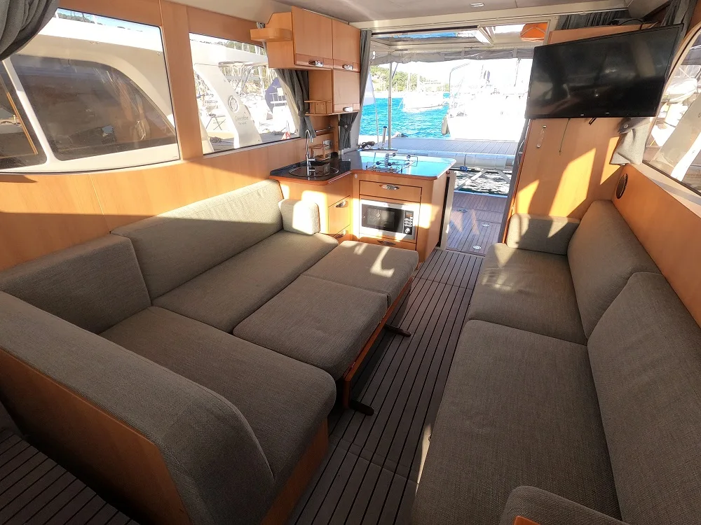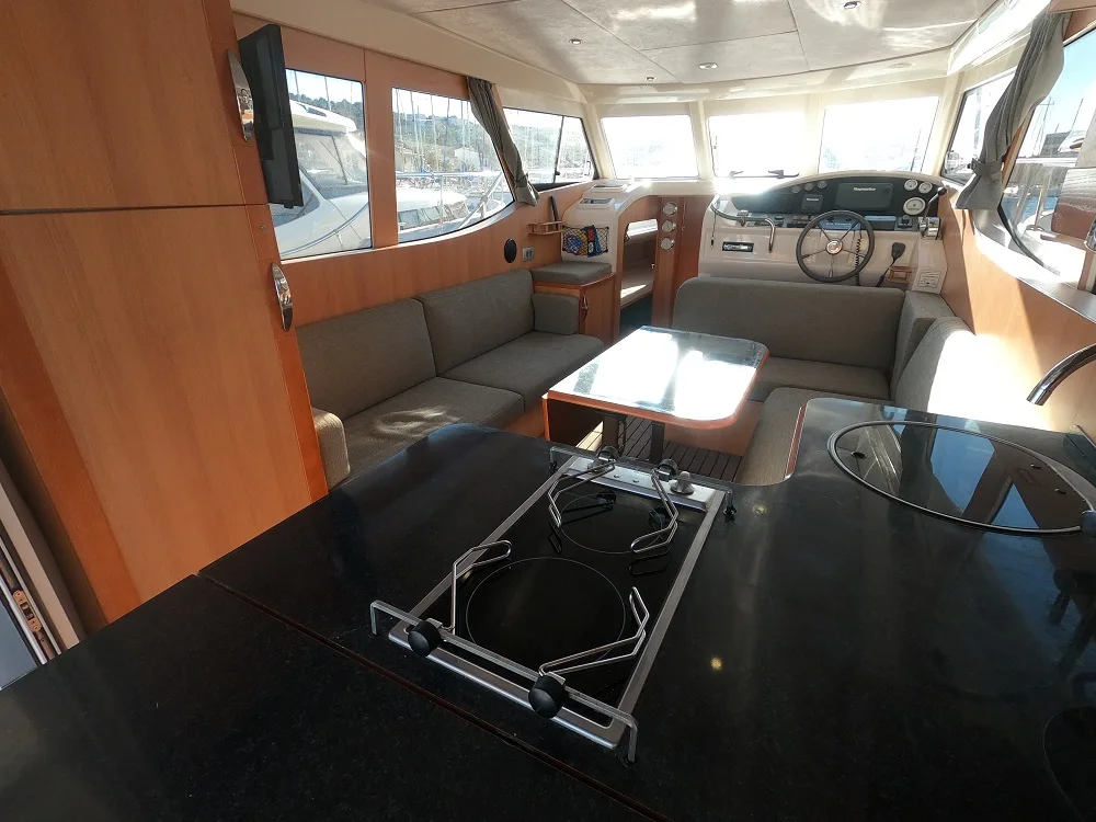 Ce trawler est disponible en location dans le Var. Il possède un moteur thermique 150 CV permettant de très faibles consommations. Vous trouverez tous les avantages de naviguer sur un voilier, avec le confort d’un bateau moteur.
