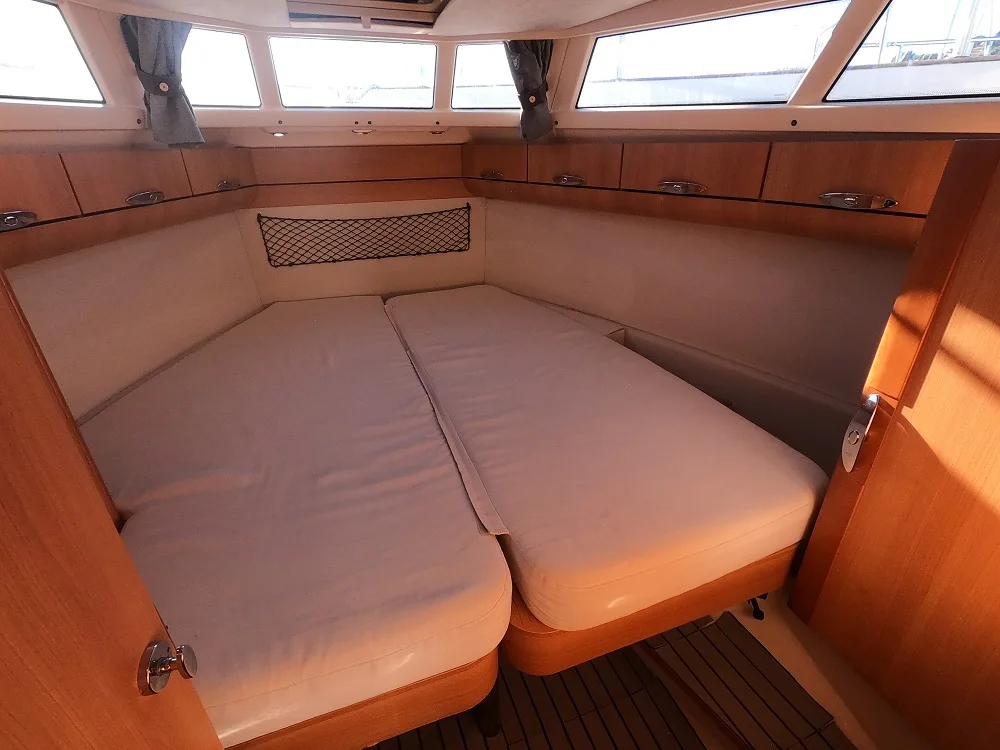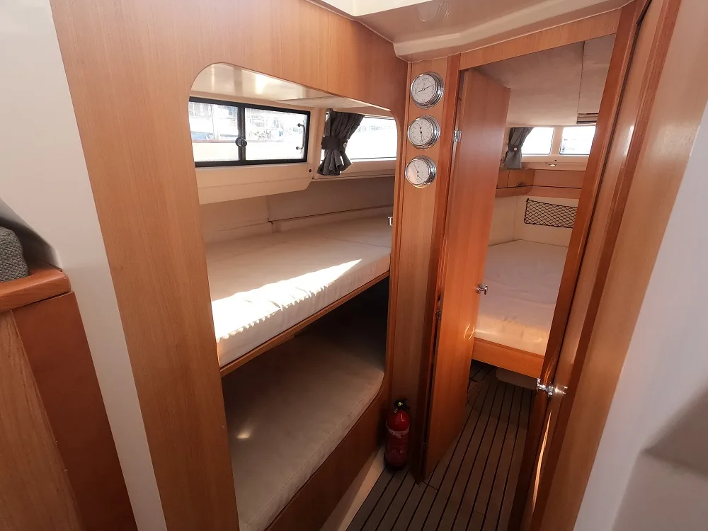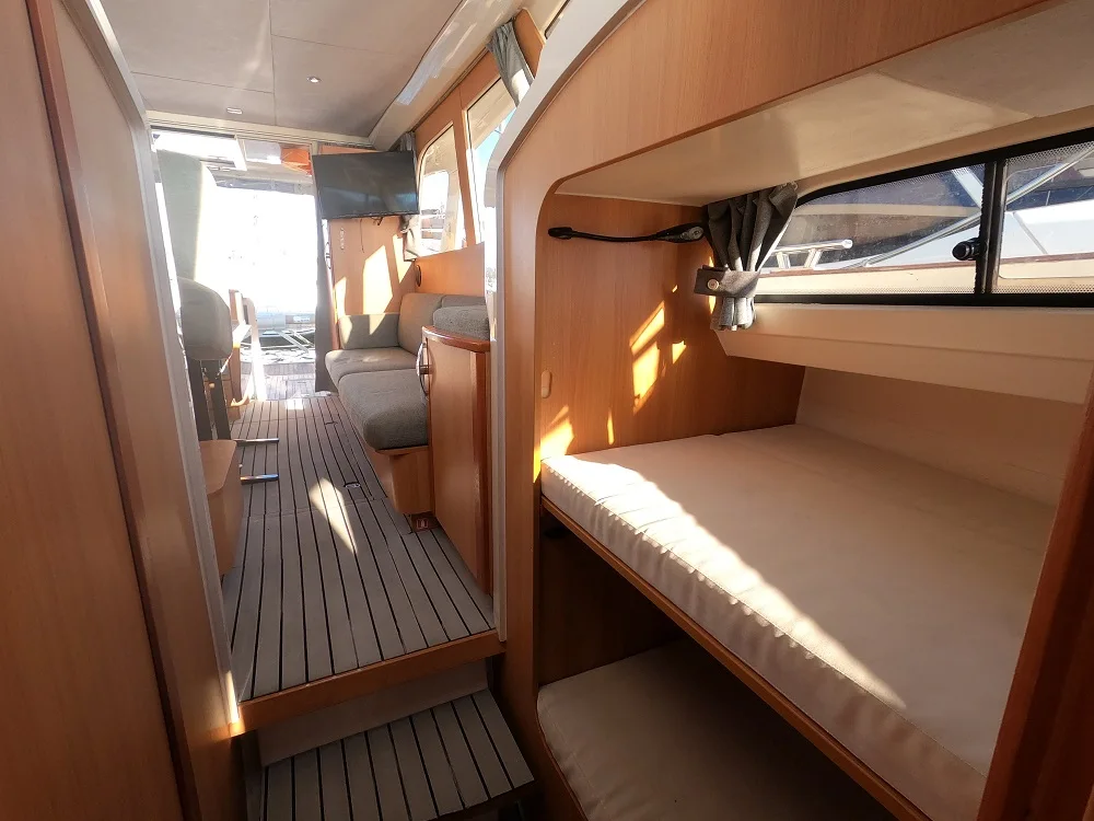 l’équipement complet de la cuisine ; grand frigo/congélateur, micro-onde, plaque à induction, prises 220V… vous permettrons de vous sentir comme à la maison. Ce Greenline 33 possède 2 cabines. La cabine avant offre un lit double parfaite pour les parents, la 2ème cabine propose 2 lits superposés, parfaits pour les enfants (ou un adulte sur le lit du bas). Les invités supplémentaires pourront dormir dans le carré transformable et la banquette du salon. Vous pourrez donc profiter de vos vacances en famille, jusqu’à 6 personnes en louant notre Greenline 33.