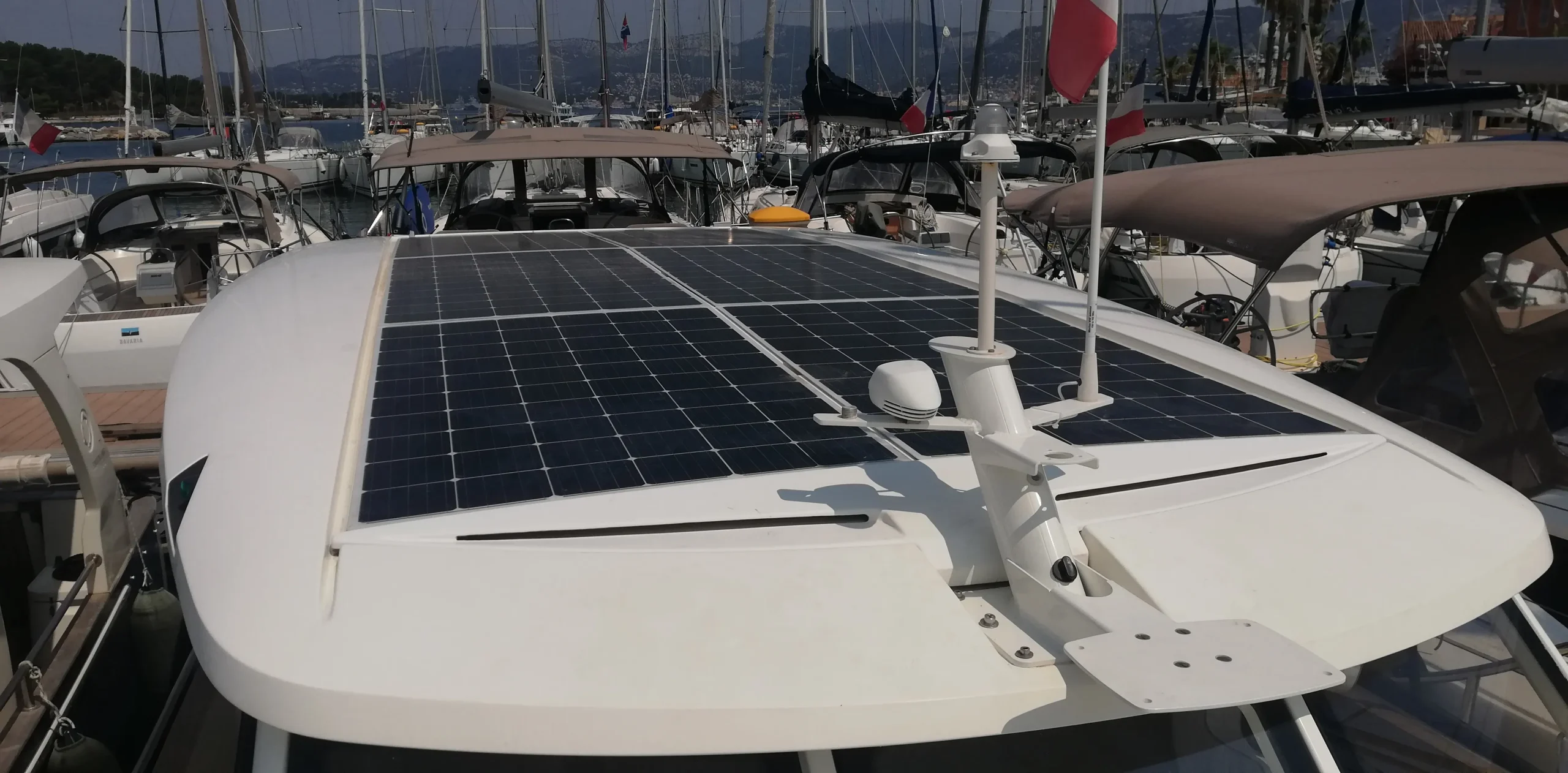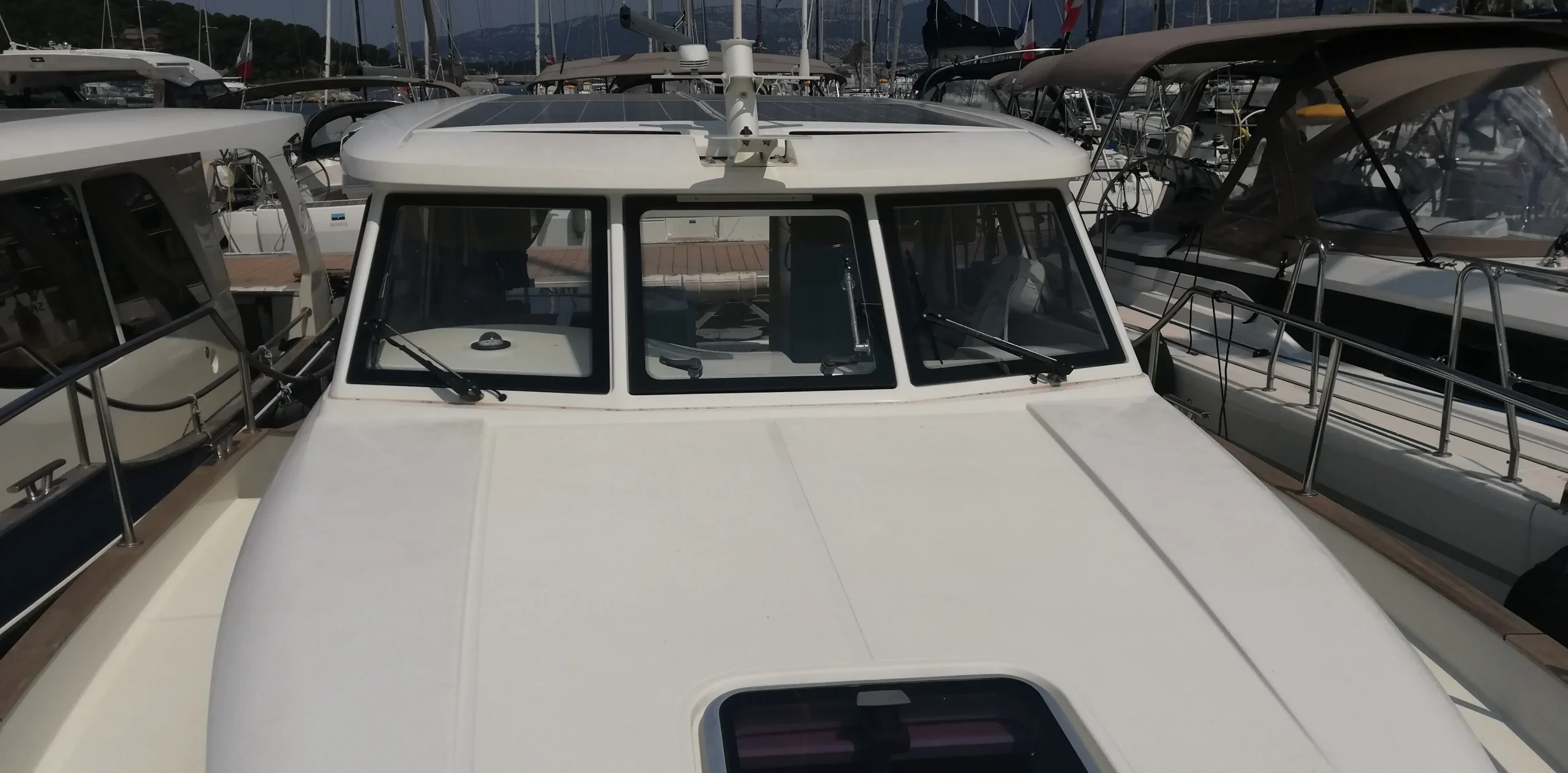 Doté de 6 panneaux solaires (1,4KW), il vous permet d’être également autonome électriquement et de profiter plus longtemps des mouillages de la Méditerranée.