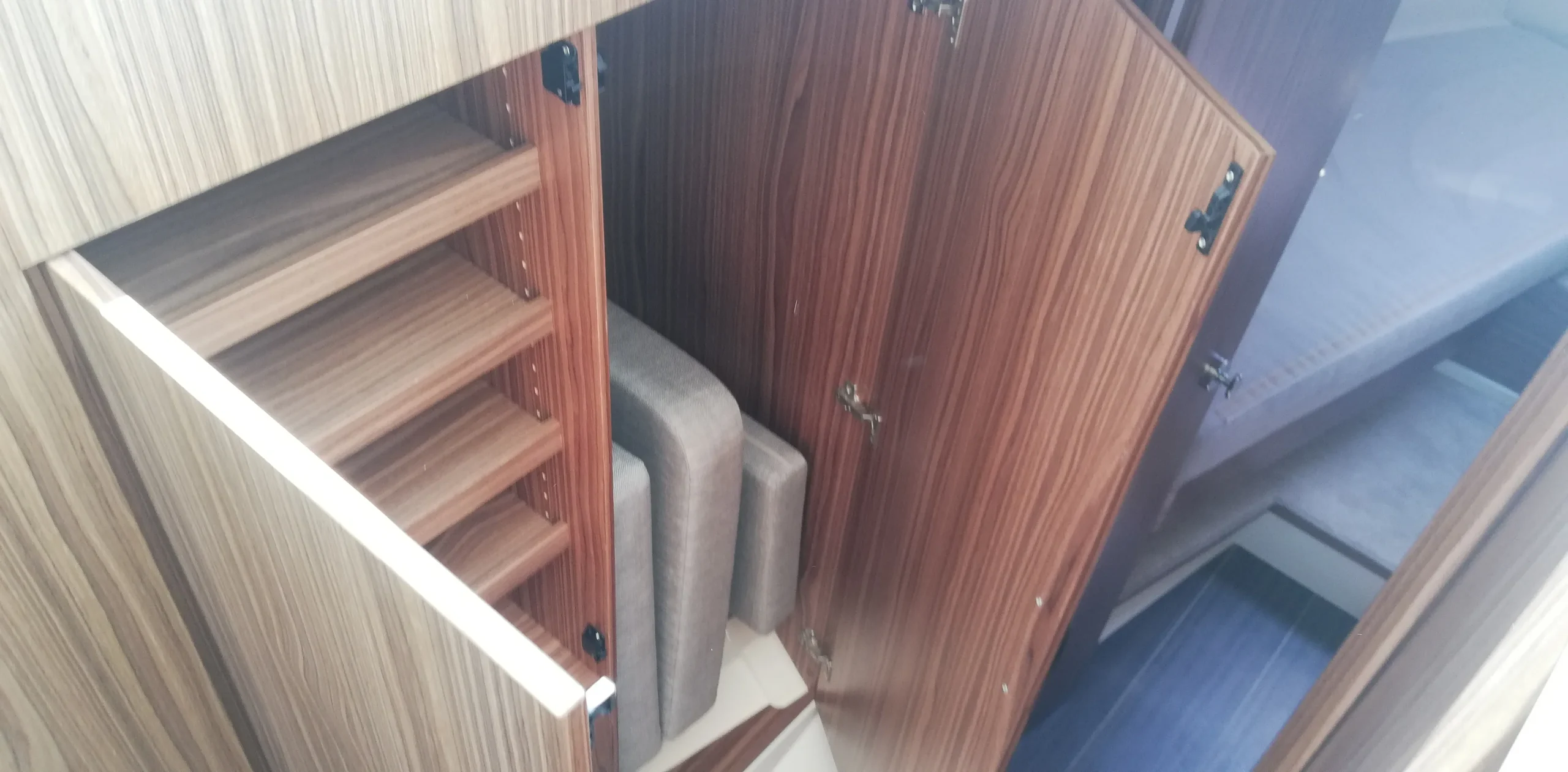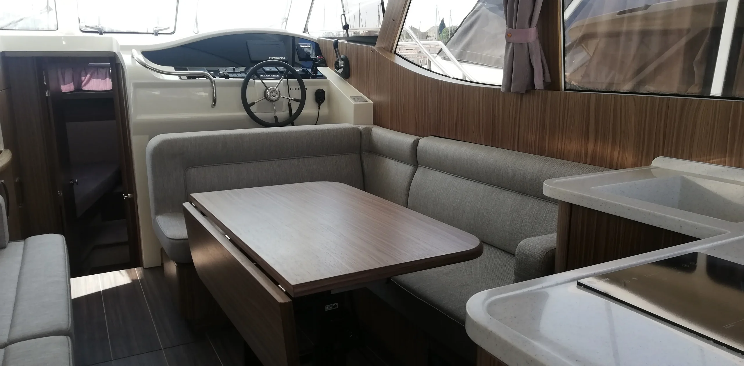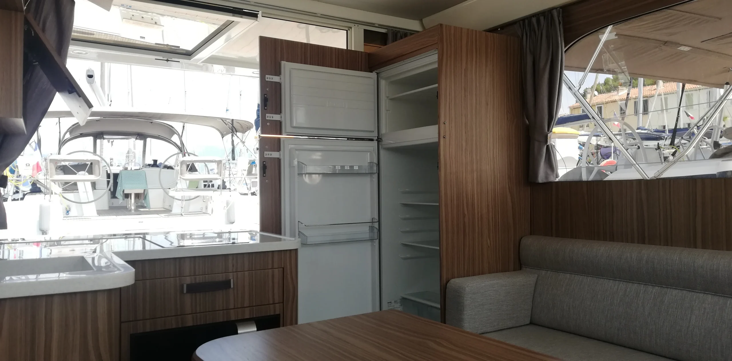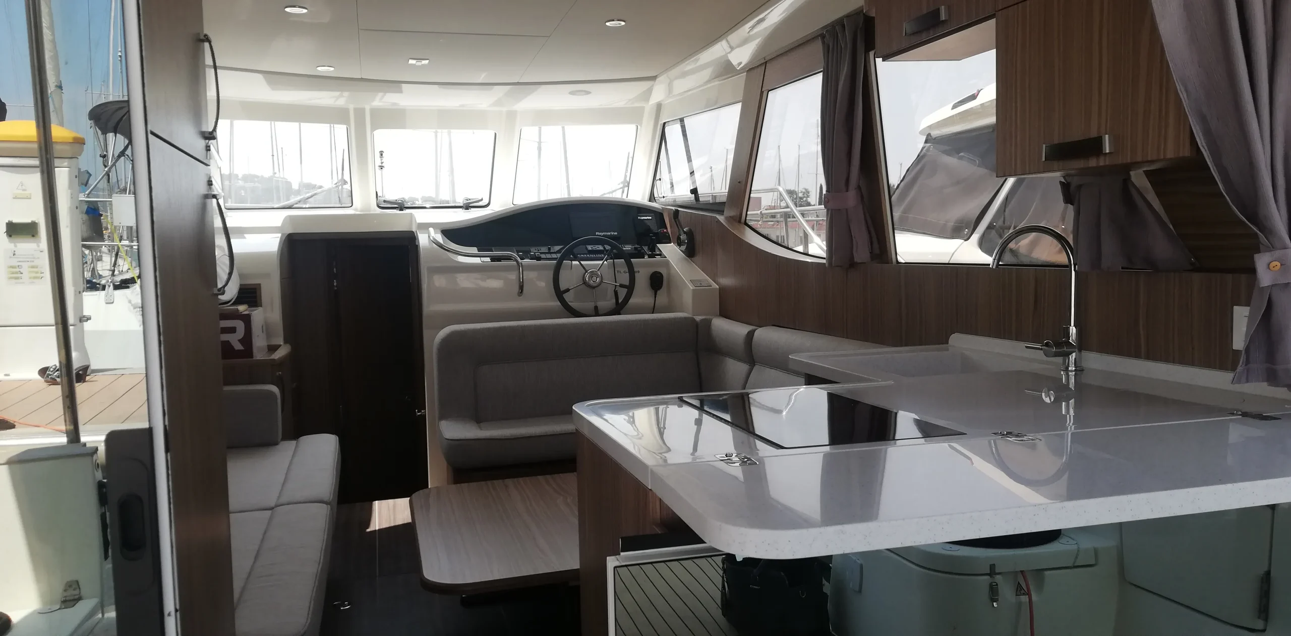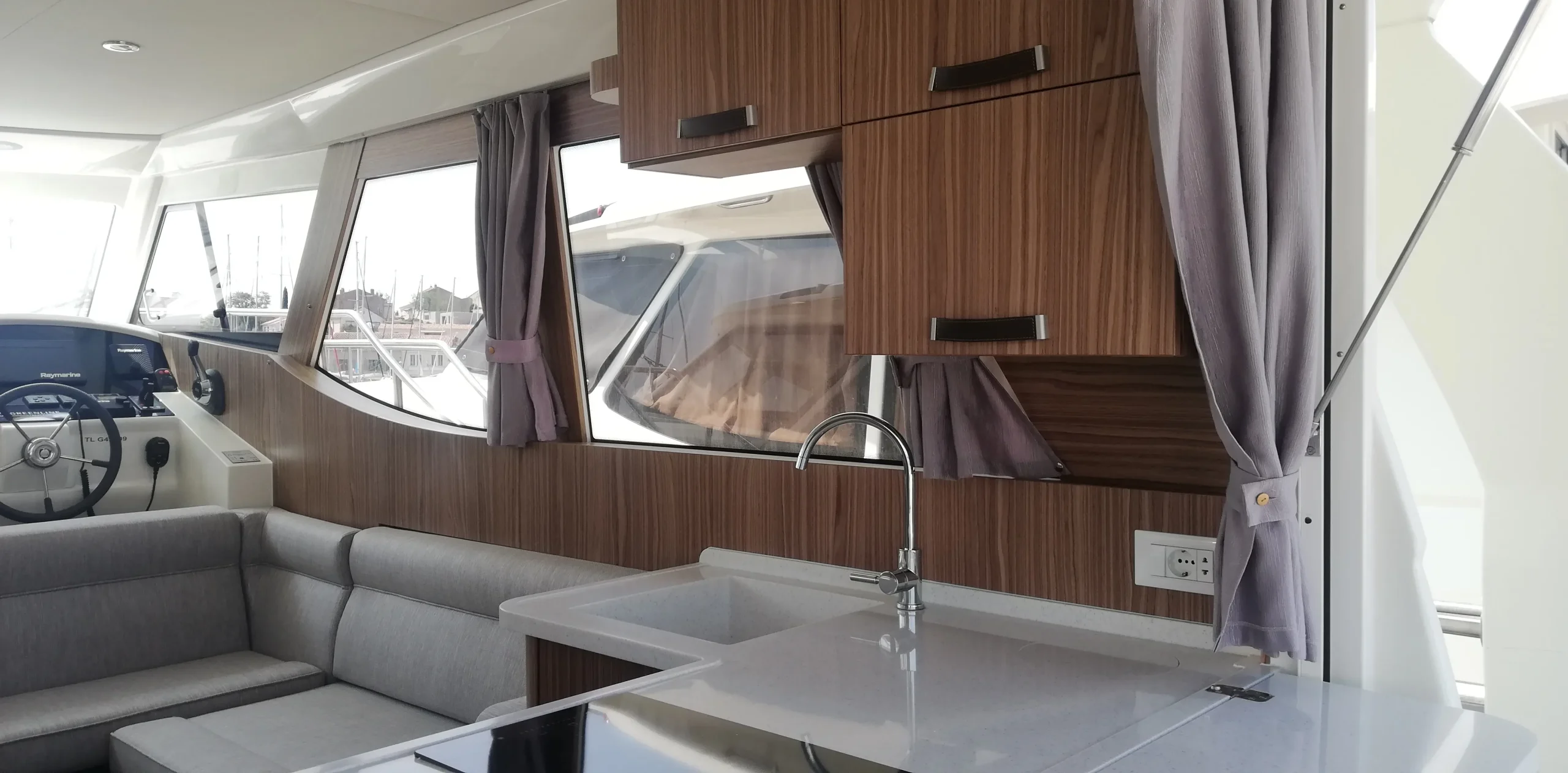 Le carré communique de plain-pied avec le cockpit, qui, une fois la plateforme électrique ouverte, vous procure une terrasse sur l’eau. La baie vitrée arrière s’ouvre sur l’extérieur et la cuisine, qui fonctionne au 220V via le convertisseur, donne directement sur l’extérieur.
