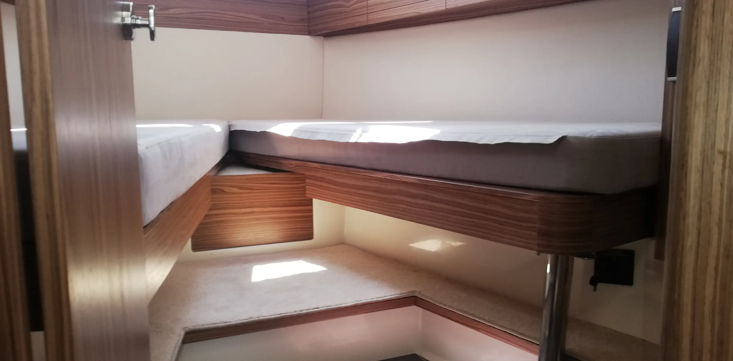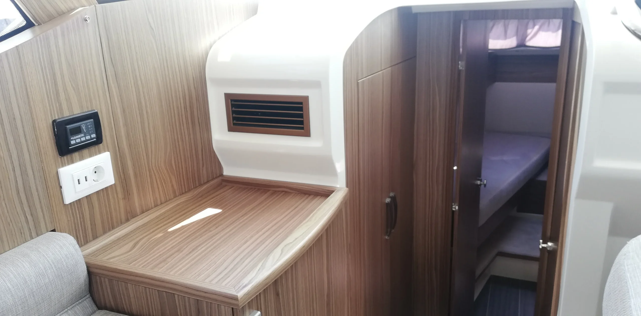 Malgré sa taille compacte de 10 mètres, le Greenline 33 offre un agencement bien pensé avec beaucoup de rangements. Il dispose d’un volume spacieux dans le carré avec une vue mer à 360°. Il peut accueillir 4 personnes dans un très grand confort pour les repas et le couchage grâce à la cabine avant et le carré transformable. De plus, vous pourrez prévoir un bel avitaillement pour votre séjour grâce au grand frigo-congélateur.