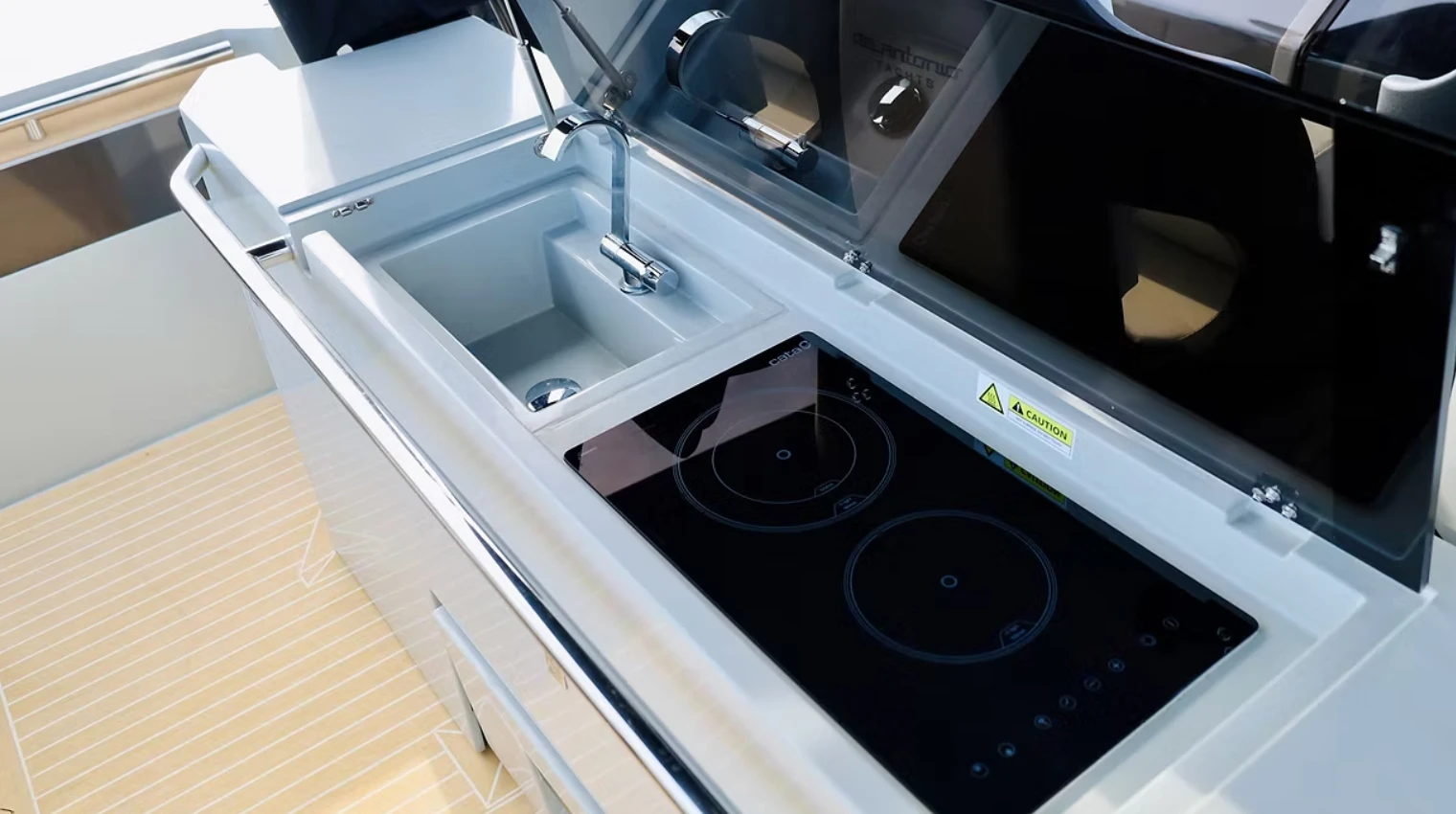 • Cuisine extérieure complète (réfrigérateur 49L, évier, plaque vitrocéramique)