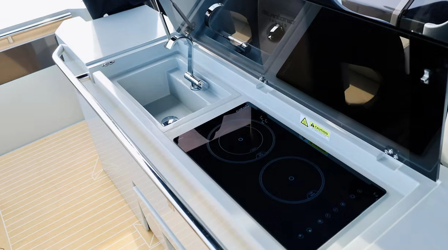 Un bateau moteur Open très complet pour sa taille, avec une carène performante au V prononcé, un grand espace sur le pont avec une distribution «walkaround». Ce bateau dispose d’un intérieur modulaire innovant au niveau des cabines avant et arrière et d’une salle de bain complète et indépendante.
