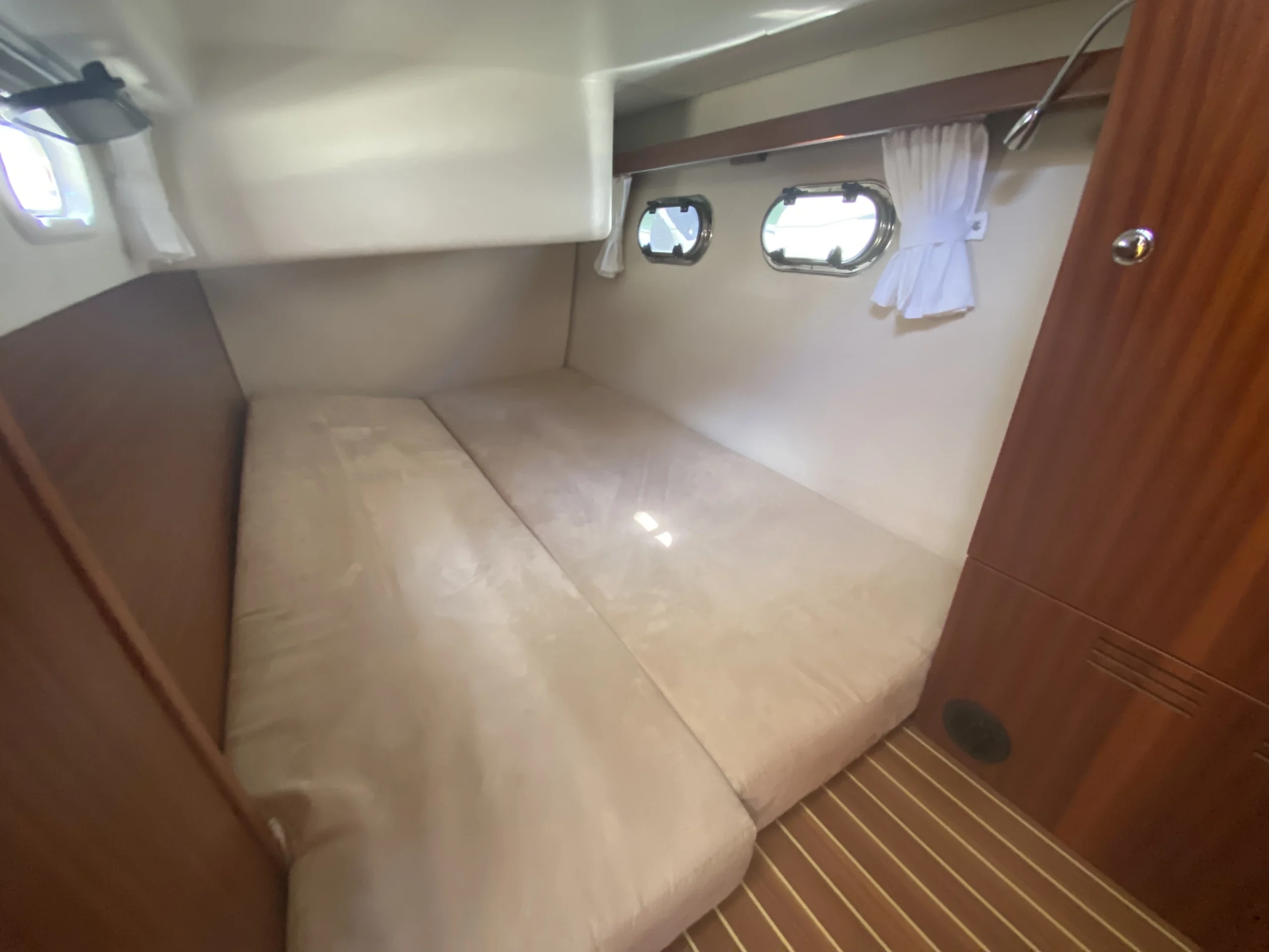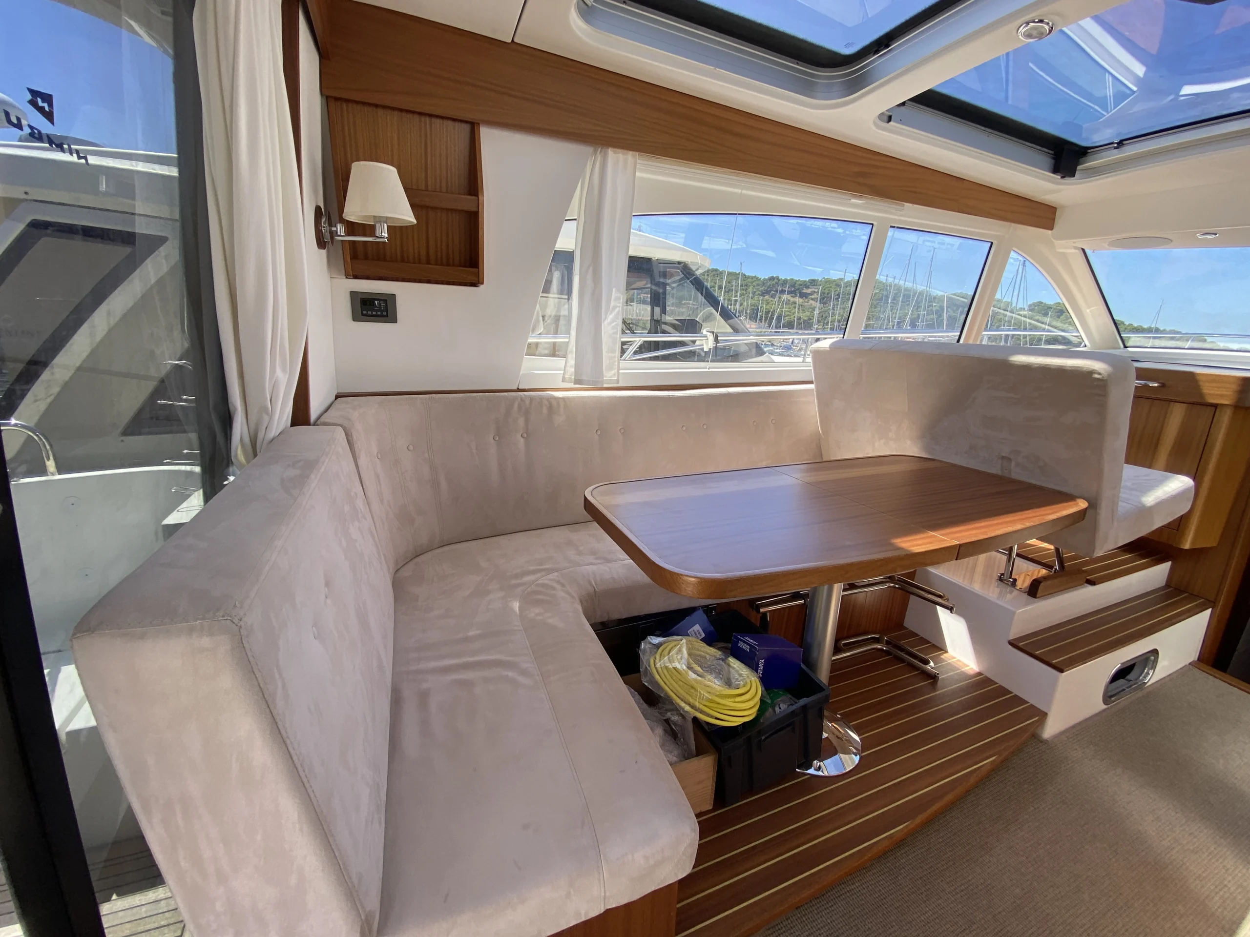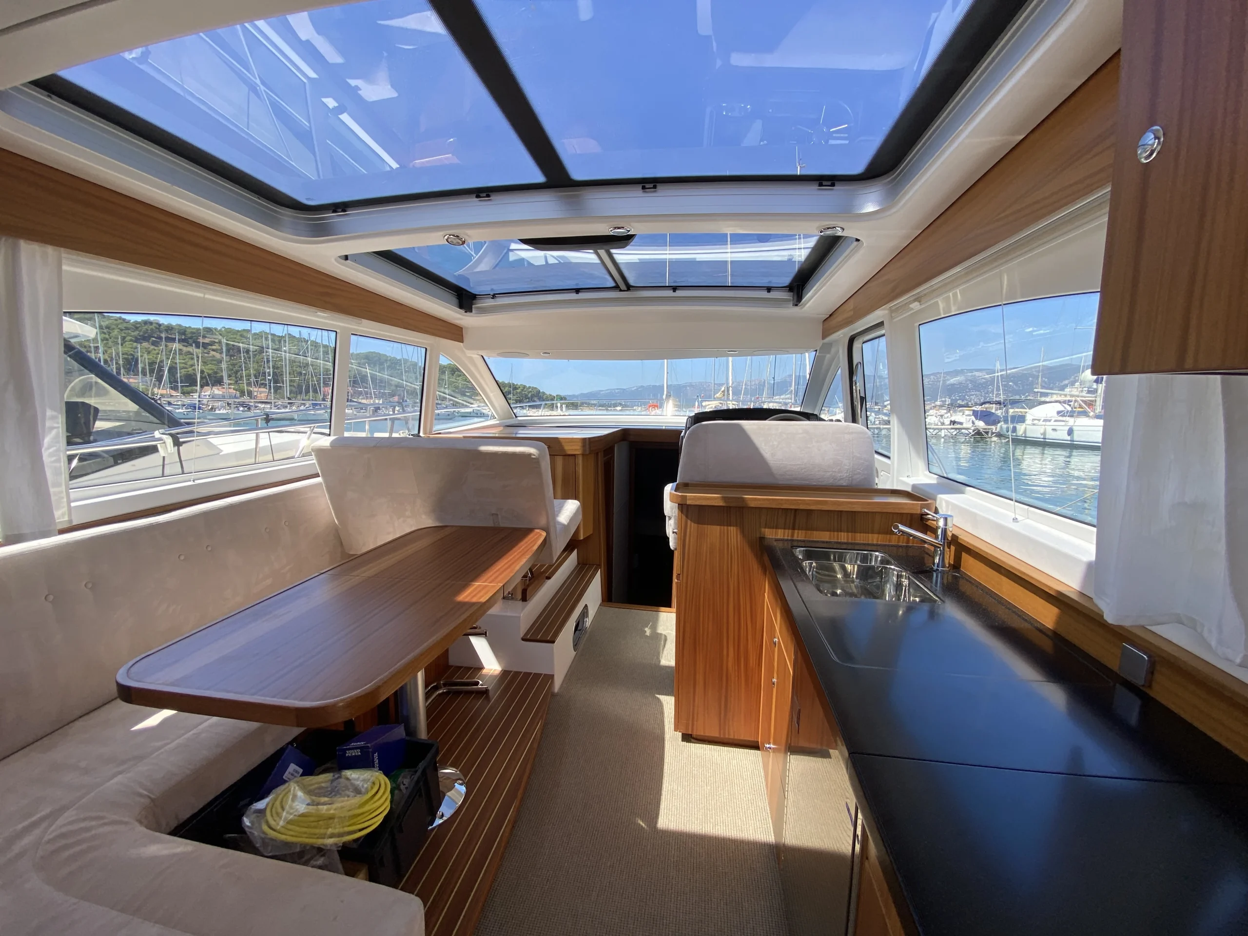 Le Nimbus 405 Coupé se démarque par ses nombreuses fonctionnalités pratiques. Grâce à une banquette modulable dans le salon, qui se transforme en assises pour les copilotes, jusqu’à 5 personnes peuvent profiter pleinement de la navigation. De plus, la table du cockpit se convertit facilement en bain de soleil, offrant ainsi un espace de détente supplémentaire. La grande baie vitrée et l’immense toit ouvrant apportent modernité et luminosité, créant une atmosphère chaleureuse à bord.